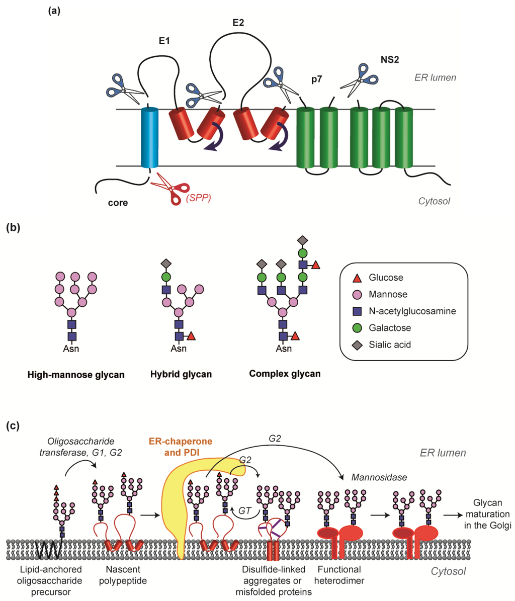 While the presence of O-glycans on HCV envelope glycoprotein remains disputed, their N‑glycosylation has been extensively studied [50,51,52,53]. Actually, N-glycans account for half the mass of HCV glycoproteins, with up to 5 glycans on E1 and up to 11 on E2 (genotype 1a). They modulate HCV infectivity and neutralization but also determine the folding and heterodimerization of E1E2 [50,53]. N-glycosylation starts in the ER. The sequence of events leading to high-mannose, hybrid or complex glycans has been described in detail by others [54]. In brief, a core oligosaccharide is formed in the ER and transferred en bloc by an oligosaccharyltransferase from its dolichol anchor onto the nascent polypeptide. A complex sequence of glycan trimming, protein folding and glycan modification follows and can continue in the Golgi apparatus. Hence, N-glycosylation offers a wide range of variations on the basis of a core oligosaccharide [54] (Figure 3b). In the ER, the variability is limited to high-mannose glycans. However, proteins that traffic to the Golgi display a much broader variety of hybrid or complex glycans that result from the transfer by Golgi transferases of galactose, N‑acetylglucosamine, sialic acid or fucose residues onto the glycan precursor. This is the case for HCV glycoproteins that travel through the Golgi incorporated in the viral particle [10,55].