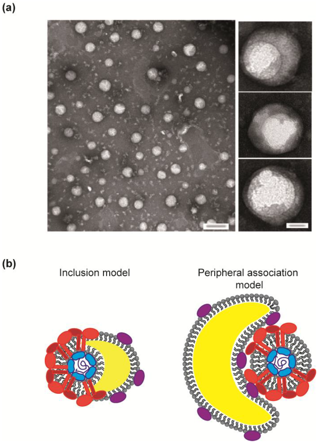 HCV virion heterogeneity. (a) Transmission EM pictures of HCV virions, reproduced from Catanese et al. [14], with permission. HCV particles were purified over heparin column and the high infectivity fractions isolated by density gradient ultracentrifugation. Note the diversity in virion size and the absence of apparent symmetry. The close-up pictures represent examples of particles with possible internal structures; although the 2D imaging technique used cannot exclude the superposition of separate particles. (b) Theoretical models for the HCV lipoviroparticle. Lipoprotein constituents might be incorporated within the HCV particle, thus forming a true lipoviroparticle (left panel), as supported by André et al. [101,110] or peripherally associated, as already proposed by Lindenbach et al. [5]. Please see the main text for the detailed description.