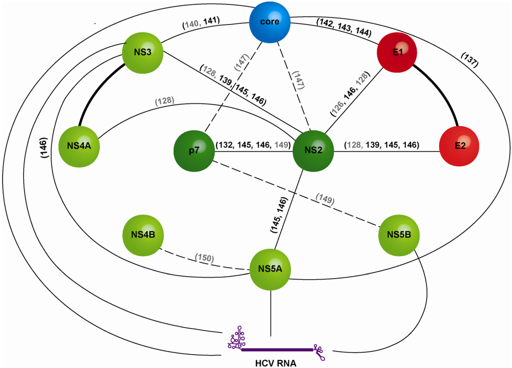 The link between structural and non-structural proteins made by p7 and NS2 has been extensively explored. It is supported by the position of their precursor in the polyprotein and by the necessary compatibility between the protein sequences. Thus, the capacity of an HCV chimera to produce high-titer virus depends on the compatibility between NS2 first TM segment and the structural proteins on one side, and between NS2 C-terminus and the non-structural proteins on the other side [148]. Further protein sequence compatibilities have been evidenced by the emergence of second-site mutations arising in assembly-impaired HCV mutants [126,128,132,137,139,140,141,142,143,144,145,146,147,149,150,151]. Such genetic interactions are indicative of direct or indirect physical interactions between the proteins in the assembly process. Figure 7 attempts to summarize the complex network of interactions supported by these genetic studies and physical interaction data.