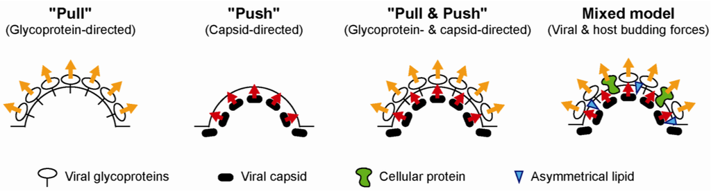 Enveloped viruses hijack a portion of cellular membrane for envelopment of the viral capsid. In the case of HCV, the virions bud in the ER lumen and are released through the secretory pathway. For budding to happen, curvature and scission of the host membrane are needed. Enveloped viruses have evolved three main strategies to induce the membrane curvature and initiate budding [95] (Figure 8). In the “push” model, the virion inside, that is to say the capsid or matrix, exerts a pressure on the membrane. In the “pull” model on the contrary, the budding driving force comes from the outside, as the glycoproteins pull the membrane. The third model, “push and pull” combines the two forces, and can involve the direct recruitment of the nucleocapsid or matrix by the envelope proteins.