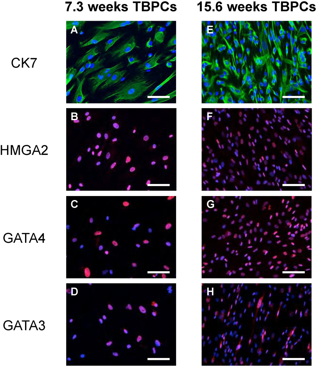 TBPCs express markers of trophoblasts and pluripotency. TBPCs from 7.3 weeks (left panel) and 15.6 weeks (right panel) of gestation were immunostained for CK7 (A, E), HMGA2 (B, F), GATA-4 (C, G) or GATA-3 (D, H). Nuclei were counterstained with DAPI. Scale bar = 100 µm.