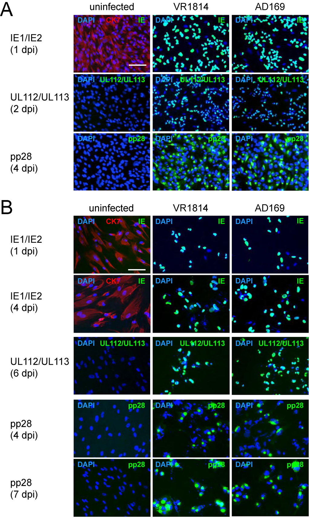 VR1814 and AD169 replicate in TBPCs. Cells from 15.6 weeks (A) or 7.3 weeks (B) of gestation were infected (MOI 2) and immunostained for HCMV IE1, pUL112/pUL113 or pp28 at the indicated time points (green). Mock-infected controls were immunostained for CK7 (red). Nuclei were counterstained with DAPI (blue). Scale bar = 100 µm.