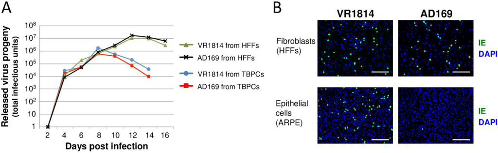 (A) Infected TBPCs release progeny virions. CM from VR1814- and AD169-infected TBPCs and HFFs (MOI 0.1) were collected at the indicated time points and titrated on HFFs. (B) Progeny virions from TBPCs retain tropism. CM from VR1814- and AD169-infected TBPCs (8 dpi) was added to HFFs and ARPE-19 cells, and IE1 was immunostained (1 dpi). Nuclei were counterstained with DAPI. Scale bar = 200 µm.