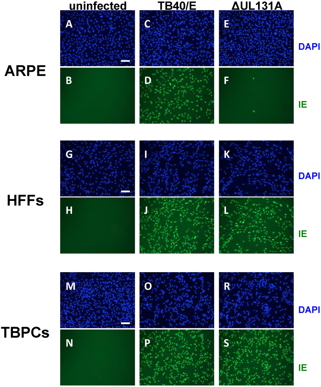 HCMV pentamer complex is dispensable for virion entry into TBPCs. ARPE-19 cells (A–F), HFFs (G–L) and TBPCs (M–S) were mock infected or infected (MOI 2) with parental TB40/E and UL131A-deficient mutant (ΔUL131A) and immunostained for IE1 proteins (2 dpi). Nuclei were counterstained with DAPI (blue). Scale bar = 100 µm.