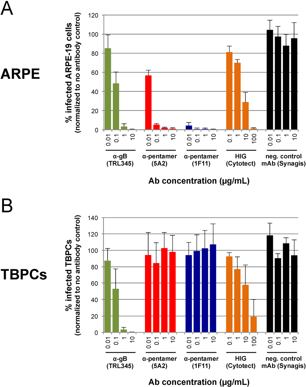 Infection of TBPCs is blocked by a mAb to gB but not mAbs to the pentamer complex. (A) VR1814 (MOI 0.01) was pre-incubated with medium alone, a serial log10 dilution of the indicated mAb (0.01–10 µg/mL) or HIG (0.1–100 µg/mL). Virus-antibody mixtures were then applied to ARPE-19 cells. At 2 dpi, IE1 was immunostained and numbers of infected cells were counted. Data were normalized to the no Ab control. Error bars indicate standard deviation. (B) TBPCs were incubated with virus-antibody mixtures and analyzed as described for panel A.