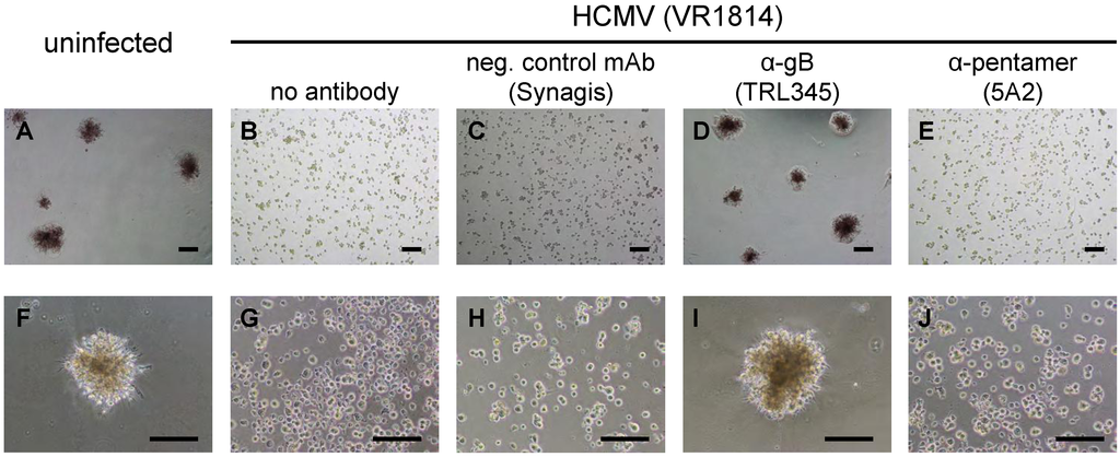 When cultured under differentiation conditions, TBPCs form trophospheres and express markers of differentiated iCTBs and STBs [27], a process that mimics early differentiation in utero. In contrast, infected TBPCs fail to differentiate and form trophospheres [37]. We therefore examined whether TRL345-mediated virus neutralization could preserve the ability of TBPCs to differentiate and form trophospheres. For these experiments, TBPCs were infected with VR1814 or a virus-antibody mixture containing 20 µg/mL anti-gB mAb (TRL345), 20 µg/mL anti‑pentamer mAb (5A2) or 20 µg/mL negative control mAb (Synagis), or they were left uninfected. At 3 dpi, culture conditions were changed to induce differentiation (see Experimental Section). At 4 dpi, differentiating TBPCs (uninfected) formed trophospheres with diameters of approximately 200–250 µm (Figure 6A,F). In contrast, infected TBPCs generally failed to form spheres, and the few spheres that assembled had diameters of approximately 50 µm or less (Figure 6B,G). TBPCs incubated with anti-gB mAb-treated VR1814 retained the capacity to differentiate and formed large trophospheres (Figure 6D,I). In contrast, TBPCs incubated with VR1814 treated with mAbs to the pentamer or the negative control mAb failed to form large trophospheres (Figure 6C,E,H,J), consistent with the failure of pentamer-specific mAbs to block infection (Section 2.4). Thus, neutralizing anti-gB mAb TRL345 precludes HCMV infection of TBPCs and rescues differentiation.