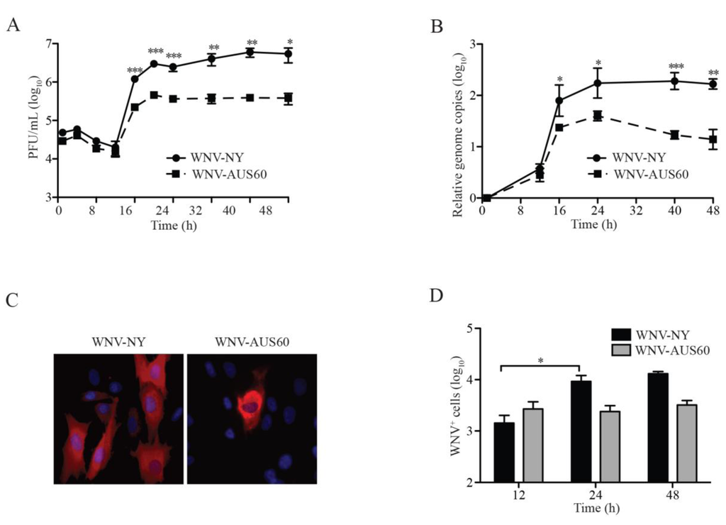 Because dermal fibroblasts are likely one of the first cell types to become infected following the blood meal of a mosquito, we compared the replication kinetics of insect cell-passaged WNV-NY and WNV-AUS60 in human dermal fibroblasts (HDFs) using a multistep growth curve. Both neuroinvasive, WNV-NY, and nonneuroinvasive, WNV-AUS60, strains replicated within HDFs without obvious induction of cytopathic effects (CPE) (data not shown) and reached peak infectious particle production between 20 and 24 h post-infection (Figure 1A). However, peak viral titers of WNV-AUS60 were approximately one log lower than WNV-NY. Additionally, quantitative RT-PCR (qRT-PCR) analysis revealed that the kinetics of WNV-NY and WNV-AUS60 genome replication occurred at similar rates (Figure 1B). Peak levels of viral genome accumulation were detected at 24 h post-infection and lower levels of viral genomic RNA were detected at all times in WNV-AUS60-infected cells compared to WNV-NY-infected cells. Therefore, although both strains were capable of establishing an infection within HDFs, the nonneuroinvasive strain, WNV-AUS60, never reached levels of replication as high as the neuroinvasive strain, WNV-NY.