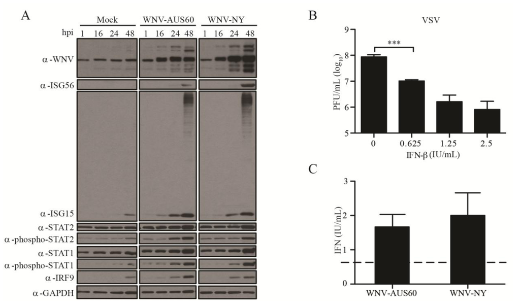 Antiviral response to WNV-AUS60 and WNV-NY in HDFs. (A) Steady state protein levels of WNV, ISG56, ISG15, Phospho-STAT-2, STAT-2, Phospho-STAT-1, STAT-1, IRF-9, and GAPDH in mock and WNV-infected (MOI = 0.05) HDF cells. Extracts prepared at the indicated times post-infection were examined by immunoblot. A representative example from three independent experiments is shown; (B) Sensitivity of HDFs to IFN. HDF cells were treated with 0, 0.625, 1.25, or 2.5 IU/mL IFN-β for 24 h prior to infection with vesicular stomatitis virus (VSV) (MOI = 1). Supernatants were collected at 24 h post-infection and VSV titers were determined by plaque assay on Vero cells. Values represent the average number of plaque forming units (PFU) per mL (±standard error) from at least three independent experiments. Statistical significance was determined by an unpaired t-test. Asterisks indicate differences that are statistically significant (*** p < 0.001); (C) Determination of the WNV-induced IFN levels using a VSV-based bioassay on HDFs. HDF cells were treated with specified supernatants for 24 h prior to infection with VSV (MOI = 1). Supernatants were collected at 24 h post-infection and VSV titers were determined by plaque assay on Vero cells. Values represent the level of type-I IFN (IU/mL) (±standard error) from three independent experiments. The dashed line represents the limit of detection for the assay.