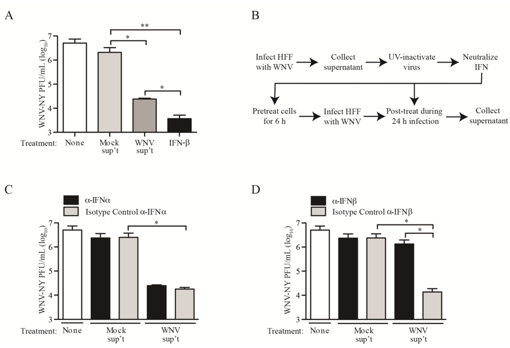 Inhibitory capacity of UV-inactivated supernatants recovered from WNV-AUS60-infected HDFs. (A) HDFs were pretreated with UV-inactivated supernatants recovered from mock- or WNV-AUS60-infected cells or 25 IU/mL IFN-β for 6 h prior to infection with WNV-NY (MOI = 0.05). Cultures were incubated for 1 h and the viral inoculum was replaced with UV-inactivated supernatants or 25 IU/mL IFN-β. Supernatants were recovered 24 h post-infection and viral titers determined by plaque assay on Vero cells. Values represent the average number of plaque forming units (PFU) per mL (±standard error) from three independent experiments; (B) Schematic of pre- and post-treatment of cells with UV-inactivated supernatants in the presence or absence of neutralizing antibodies to IFN-α or IFN-β; (C and D) Effects of neutralizing antibodies or specified isotype controls to (C) IFN-α or (D) IFN-β on the inhibitory capacity of UV-inactivated supernatants recovered from WNV-AUS60-infected HDFs. Values represent the average number of plaque forming units (PFU) per mL (±standard error) from three independent experiments. Statistical significance was determined by an unpaired t-test. Asterisks indicate differences that are statistically significant (* p < 0.05 and ** p < 0.01).