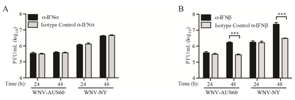 WNV replication in the presence and absence of neutralizing antibodies to IFN-α or IFN-β. HDF cells were infected with WNV-NY or WNV-AUS60 (MOI = 0.05) and the inoculum was removed after 1 h and replaced with complete DMEM containing specified isotype control antisera or neutralizing antibodies to (A) IFN-α or (B) IFN-β. Culture supernatants were recovered at the indicated times post-infection and viral titers were determined by plaque assay on Vero cells. Values represent the average number of PFU per mL (±standard error) from three independent experiments. An unpaired t-test was performed to determine significance. Asterisks indicate differences that are statistically significant (*** p < 0.001).