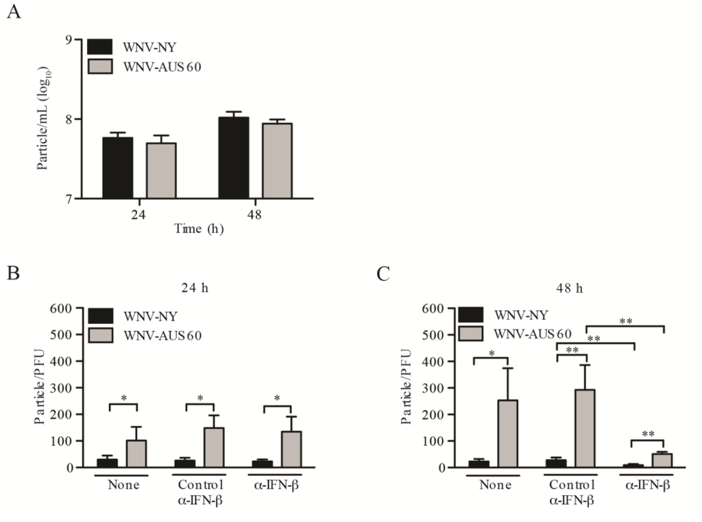 In studies utilizing several different viruses, infected cells treated with IFN produced viral particles with lower infectivity compared to untreated control cells [36,37,38,39,40,41]. To assess whether IFN plays a similar role in reducing WNV infectivity, we examined the effect of IFN-β neutralizing antibodies on the particle to PFU ratios of WNV-NY and WNV-AUS60. Although neutralization of IFN-β had no effect on total particle production (data not shown), the particle to PFU ratios for both WNV-NY and WNV-AUS60 were substantially reduced at 48 h post-infection (Figure 5C); thus, demonstrating that IFN-β plays a role in modulating infectivity of WNV particles late in the course of infection. In contrast, neutralization of IFN-β had no effect on WNV particle to PFU ratios at 24 h post-infection (Figure 5B), which is consistent with our previous data demonstrating that IFN does not regulate viral titers at this time point. Therefore, the higher level of defective particle production observed for WNV-AUS60 at 24 h post-infection was independent of IFN-β and therefore, due to a strain-specific defect in infectious particle production.