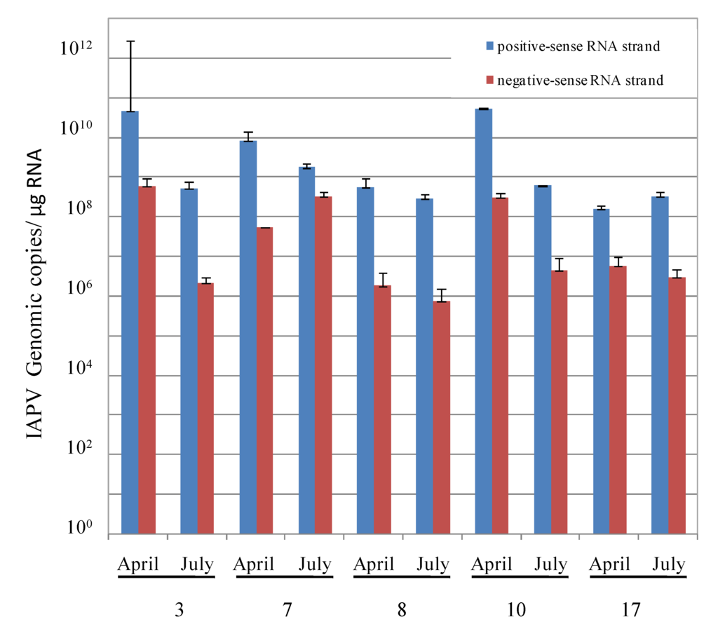 To detect IAPV replication, we reverse transcribed and amplified both the existing positive-sense strand and the putative negative-sense RNAs of IAPV from bees collected in April and July and quantified them by real-time PCR (see Materials and Methods). We detected positive and negative-sense RNA strands in all the samples tested (Figure 2). Further, the positive- to negative-strand RNA ratios observed were about 100-fold, indicative of IAPV replication (Figure 2, ibid.)