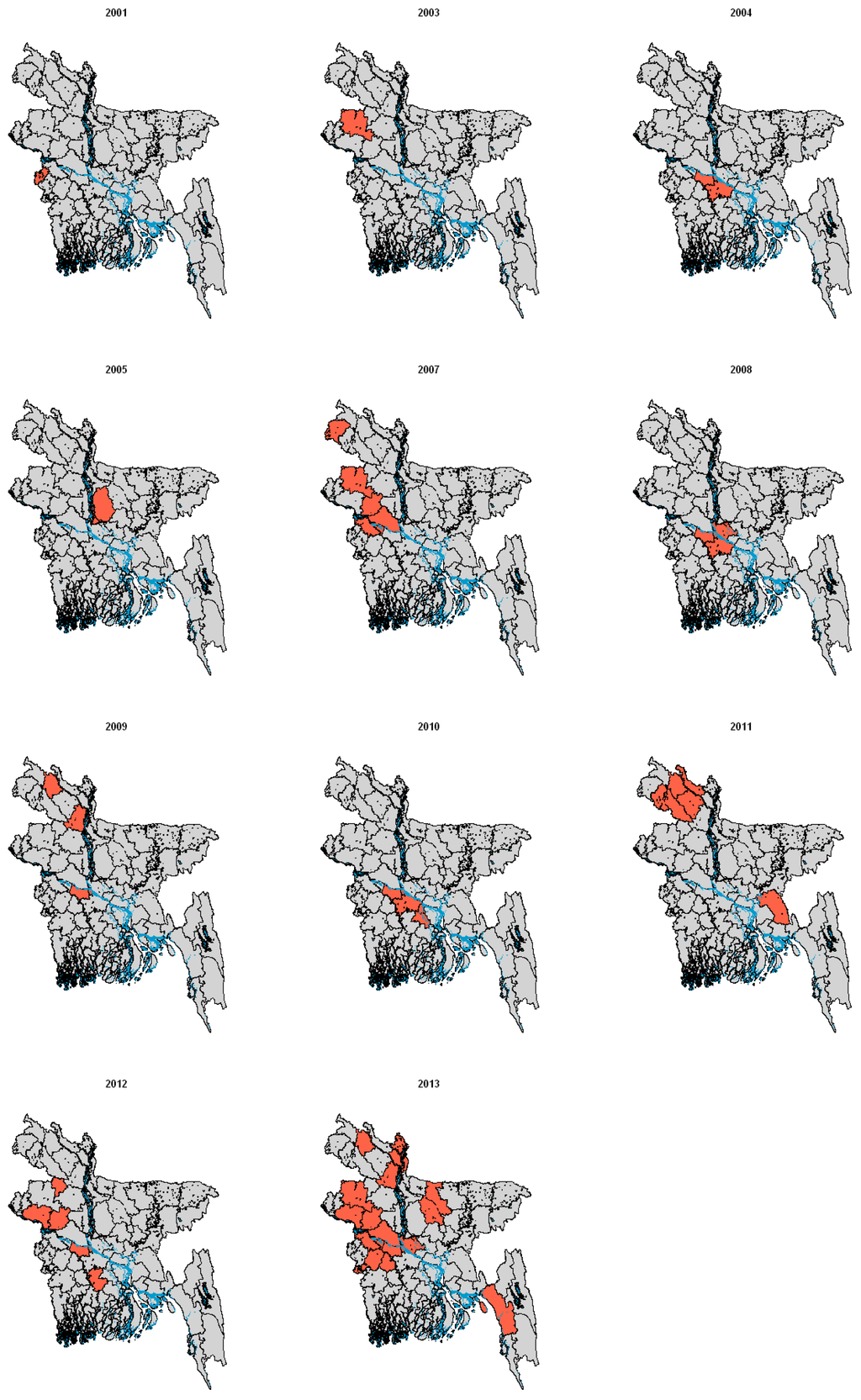 - IEDCR. Institue of Epidemiology, Disease Control and Research. Nipah infection in 2013. Update on 15 May, 2013. Available online: http://www.iedcr.org/index.php?option=com_content&view=article&id=135:23-rd-february-2013-nipah-outbreak&catid=11 (accessed on 13 May 2014).
