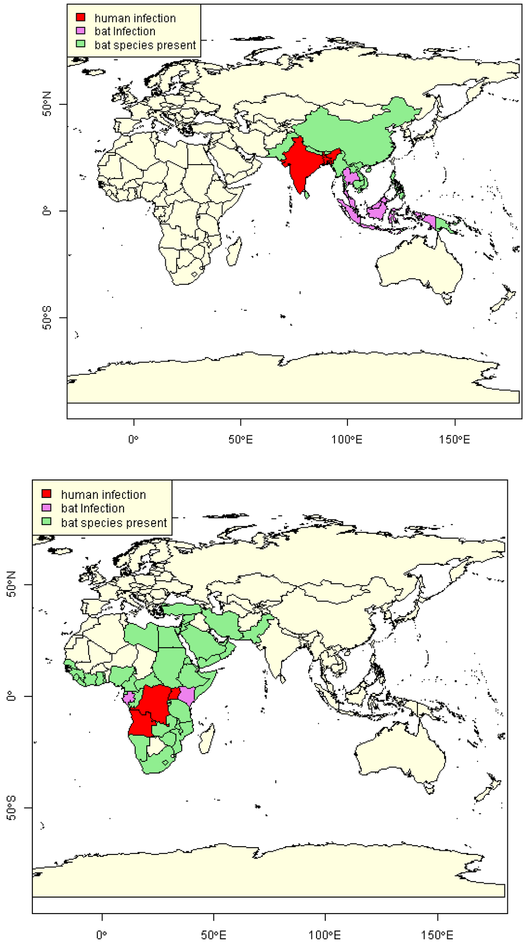 | Bangladesh | [41,42,43,82] | Antibodies | [42,49] | Pteropus giganteus |