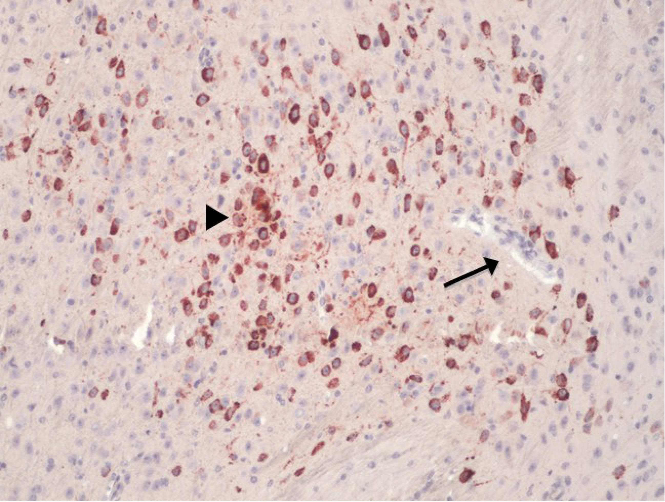 Immunohistochemical labelling with anti-flavivirus NS1 monoclonal on brain section from a Swiss CD1 mouse, infected with an Australian West Nile virus (WNV) subtype, WNVKUN. Despite ample neuronal infection (red stain, arrowhead), the endothelial cells are not infected (arrow). (Antibody binding was visualized using AEC substrate and the section counterstained with Mayer’s hematoxylin; magnification at 400×).