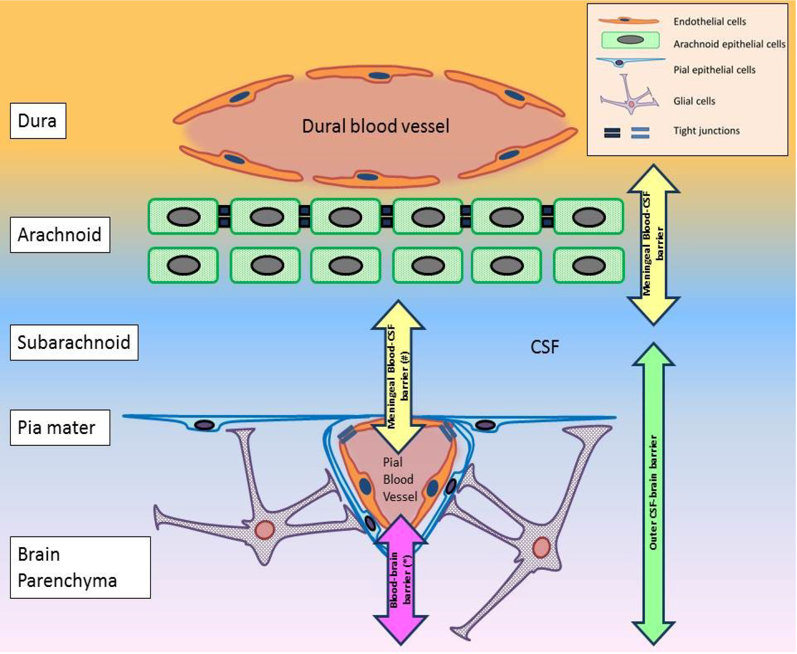 | Barriers | Blood-brain (neurovascular unit) | Blood-CSF (ventricular system) | Blood-CSF (arachnoid/meningeal) | Inner CSF-brain | Outer CSF-brain |