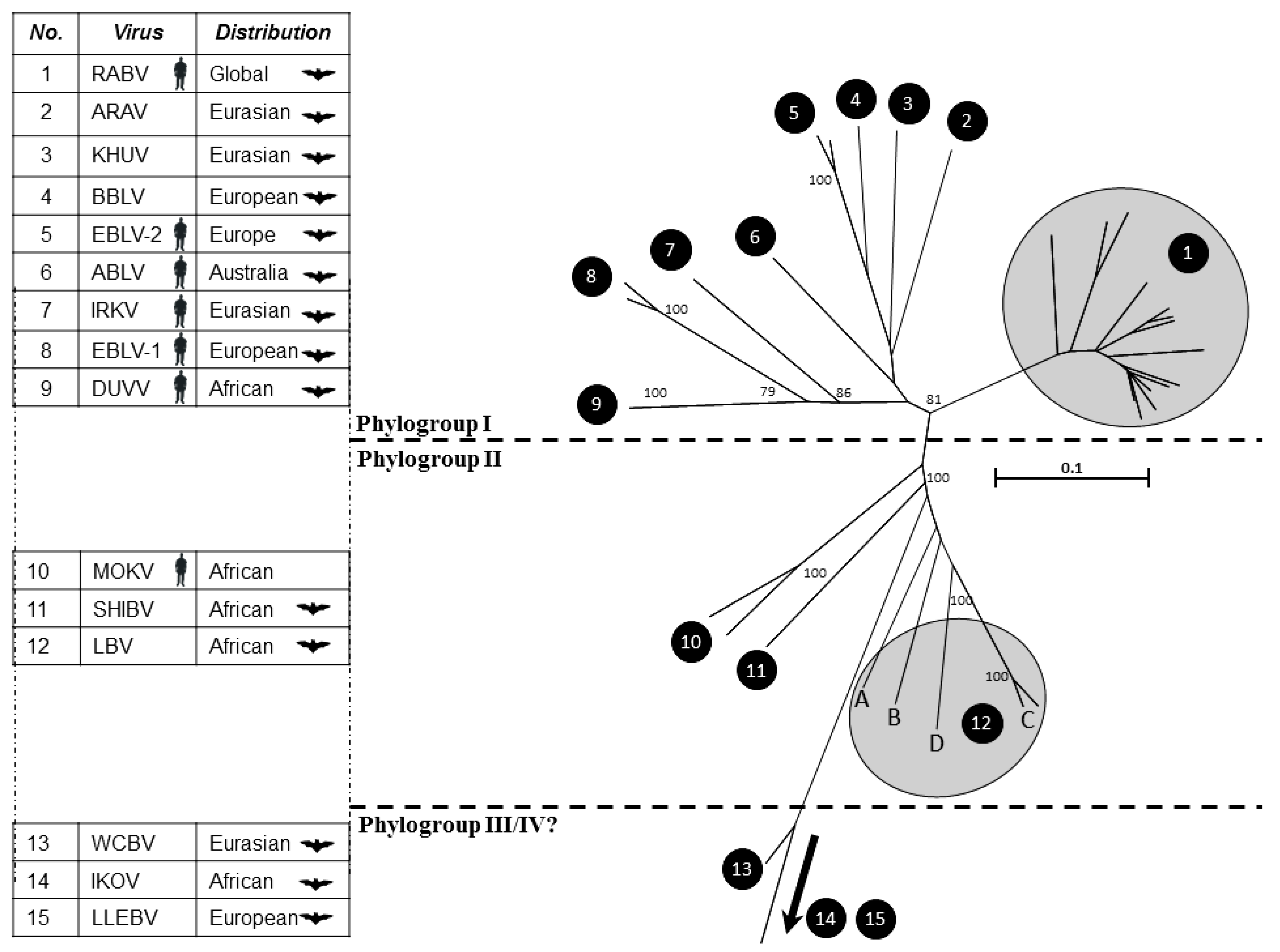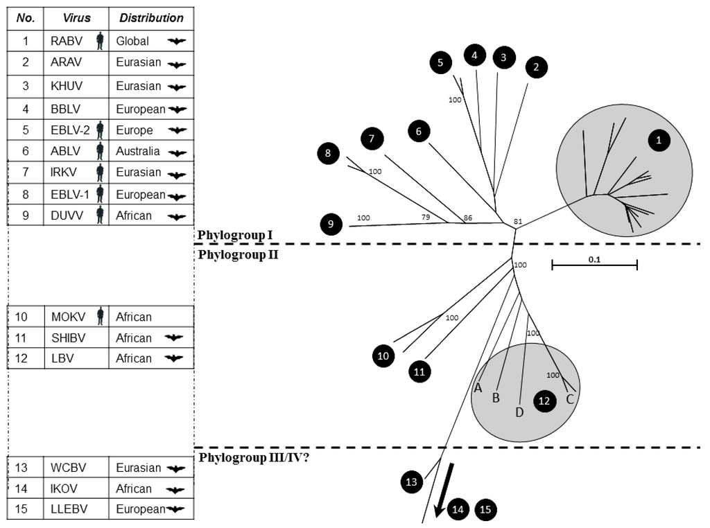 A phylogenetic analysis of the lyssaviruses. Numbers on the tree correspond to each of the lyssaviruses detailed in the accompanying table. Silhouetted species represent where viruses have been associated with bat infection and/or human fatalities. Virus acronyms are as defined in Table 1. The phylogenetic analysis is based on 405 nucleotides of the nucleoprotein gene. All sequences were aligned using ClustalW. Bootstrap values at significant nodes are shown.