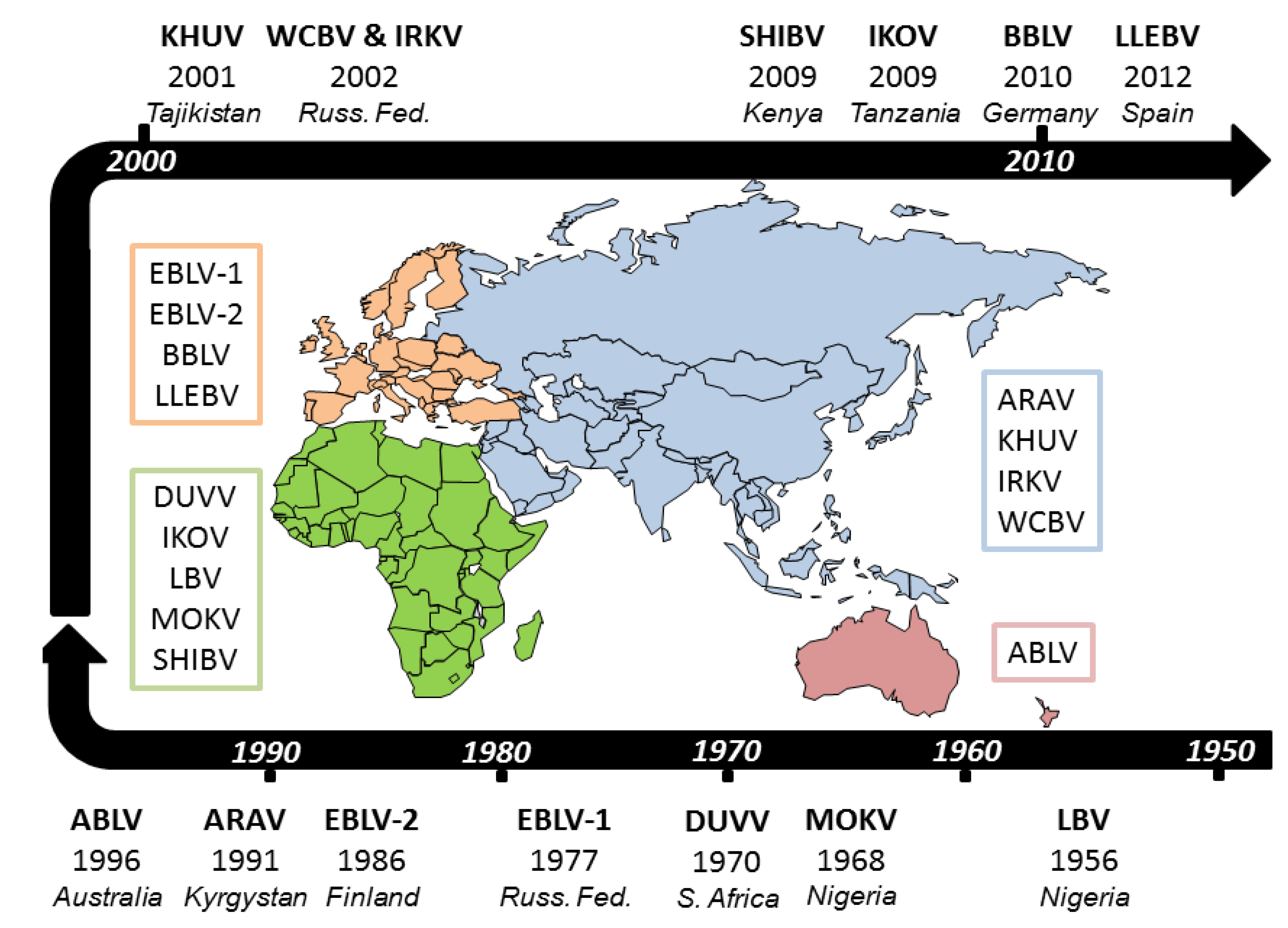 A Lyssavirus timeline. Acronyms are as detailed in Table 1. Regions where different lyssaviruses are found are coloured and dates for initial isolations are shown.