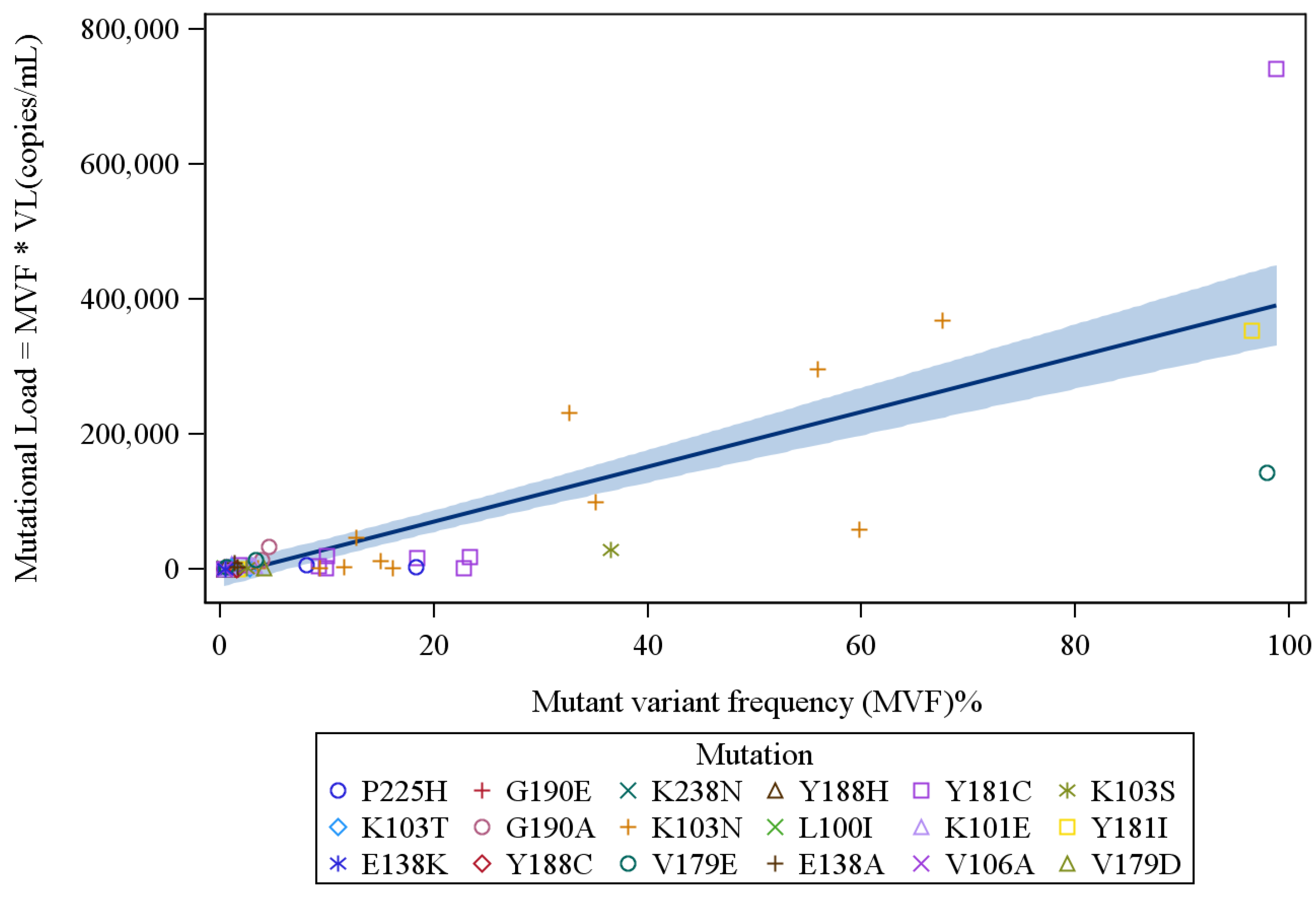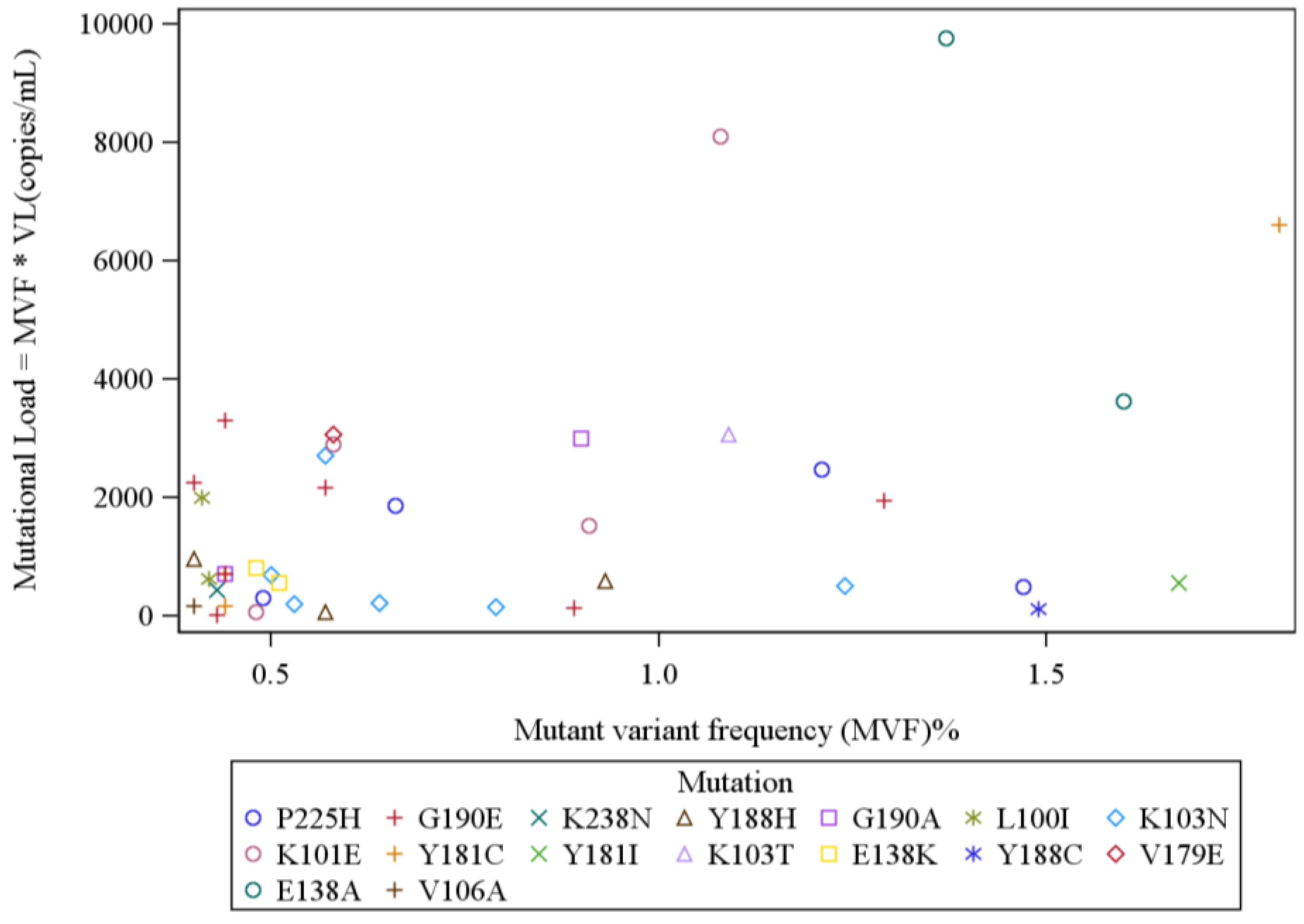 In this study, a strong correlation between NNRTI-resistant variant frequency and mutational load was identified; however, variants at low frequency had a wide range of mutational loads (>100-fold) suggesting that frequency alone may underestimate the impact of specific NNRTI-resistant variants, a very important finding.