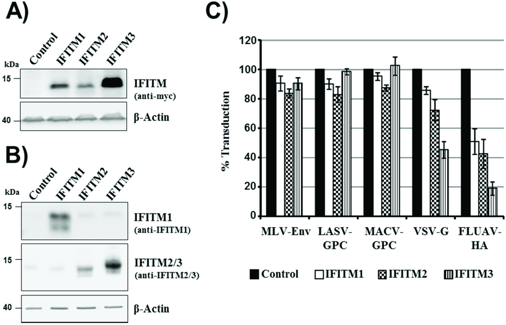 IFITM expression and antiviral activity. (A) 293T cells were transiently transduced with retroviral vectors encoding IFITM 1, 2 or 3 with a C-terminal c-myc tag or chloramphenicol acetyltransferase (cat) as control. Expression of IFITM proteins in cell lysates was determined by Western blot analysis, employing a myc-specific antibody. Expression of beta-actin was assessed as a loading control. Comparable results were obtained in a separate experiment; (B) The experiment was carried out as described for panel (A) but cells were transduced with vectors encoding IFITM proteins without antigenic tag, and IFITM expression was analyzed with an IFITM1-specific monoclonal antibody and an antiserum raised against IFITM2, which is cross-reactive with IFITM3. Similar results were obtained in an independent experiment (C) 293T cells, transiently transduced to express IFITM1, 2 or 3, or cat as described for panel (B), were transduced with infectivity-normalized MLV vectors encoding firefly luciferase and bearing the entry proteins of murine leukemia virus (MLV), Lassa virus (LASV), Machupo virus (MACV), vesicular stomatitis virus (VSV) or influenza A virus (FLUAV). At 72 h post inoculation, the transduction efficiency was determined by measuring luciferase activities in cell lysates. The average of four independent experiments, each carried out with triplicate samples, is shown. Error bars indicate standard error of the mean (SEM).