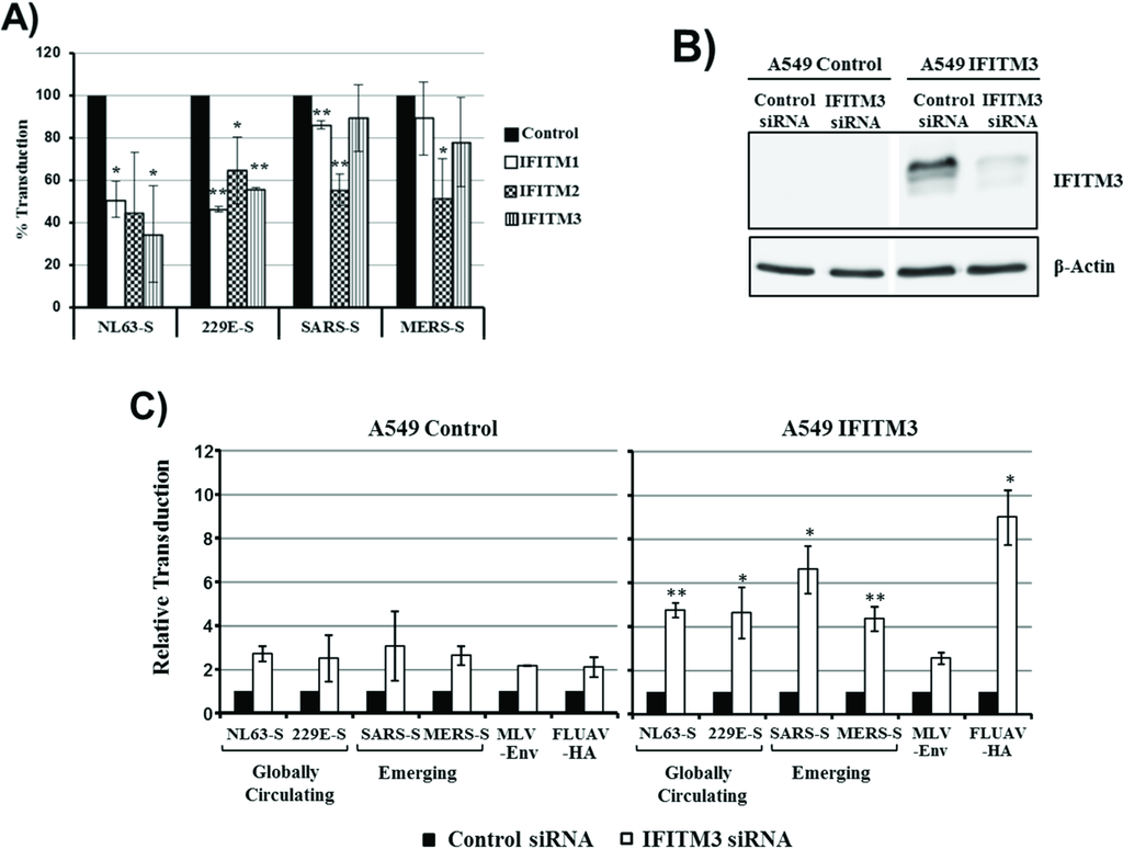 We next assessed whether the cellular entry driven by the S proteins of the human coronaviruses 229E and NL63 (229E-S, NL63-S) and the S proteins of the emerging coronaviruses SARS-CoV and MERS-CoV is differentially inhibited by IFITMs. Expression of all IFITM proteins reduced 229E-S- and NL63-S-driven entry about 40% to 70% (Figure 2). In contrast, IFITM1- and IFITM3-mediated inhibition of entry driven by SARS-S and MERS-S was inefficient (although in the case of SARS-S/IFITM1 statistically significant) and entry driven by these glycoproteins was only reduced to about 50% upon expression of IFITM2 (Figure 2). We next analyzed if the differential sensitivity to inhibition by IFITM proteins can also be detected in the context of a lung-derived cell line. For this, we engineered the human lung adenocarcinoma cell line A549 to stably express IFITM3 and analyzed the effects of an IFITM3-specific siRNA on S protein-mediated transduction. Transfection of parental A549 control cells with IFITM3 siRNA slightly increased transduction efficiency compared to cells transfected with scrambled, control siRNA. However, this effect was also observed with pseudotypes bearing the IFITM-insensitive MLV envelope protein and the IFITM-sensitive FLUAV-HA and was, thus, most likely unspecific. In contrast, transfection of A549-IFITM3 cells with IFITM3 siRNA efficiently increased HA- but not MLV-Env-driven transduction, indicating that an IFITM3-dependent block to viral entry was operative in these cells. Notably, entry into A549-IFITM3 cells driven by all S proteins studied was comparably augmented by IFITM3-specific siRNA, suggesting that the S proteins from globally circulating and emerging coronaviruses are comparably sensitive to inhibition by IFITM3 in this cellular system. In sum, 293T but not A549 cell entry driven by S proteins from human coronaviruses is more susceptible to inhibition by IFITM proteins than entry driven by the S proteins of emerging coronaviruses. Whether this differential IFITM sensitivity is due to differences in the expression levels of IFITM3, or other cellular components, remains to be determined.