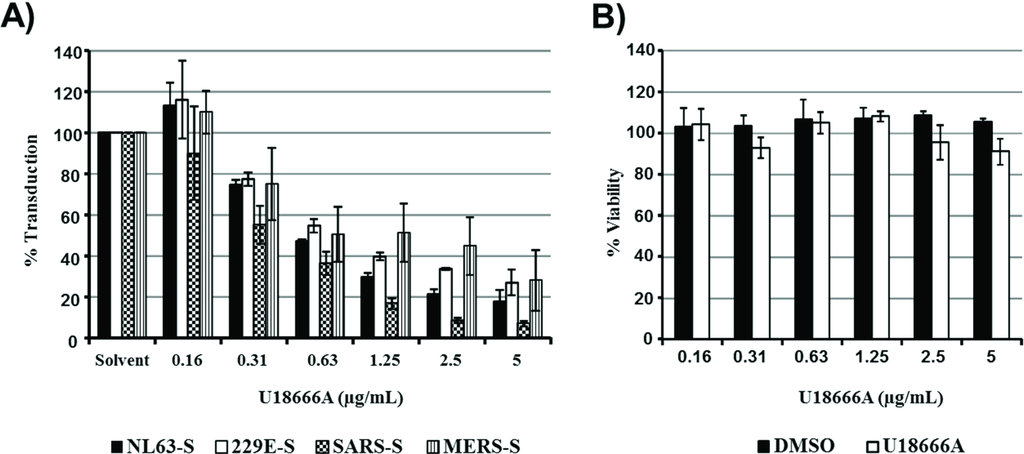 It has been suggested that IFITMs inhibit viral entry into host cells by accumulating cholesterol within late endosomes [22]. We, therefore, investigated whether entry driven by the S proteins of globally circulating and emerging coronaviruses is differentially susceptible to inhibition by U18666A, a cationic amphiphilic drug, which induces the accumulation of cholesterol in late endosomes/lysosomes [27], and has been previously studied in the context of Ebola virus entry [28,29]. However, entry into 293T cells driven by the S proteins of the globally circulating hCoV-NL63 and 229E and the emerging MERS-CoV was comparably inhibited by U18666A, while inhibition of SARS-S-driven entry was most efficient (Figure 3A). Cytotoxic effects were not observed (Figure 3B). Thus, differential sensitivity to endosomal cholesterol might not account for the differential susceptibility of these S proteins to inhibition by IFITMs.