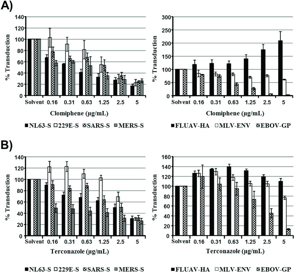 The relative sensitivities of coronavirus S protein- and FLUAV-HA-driven entry to inhibition by IFITMs and the cholesterol trafficking inhibitors clomiphene and terconazole do not correlate. 293T cells transfected to express the viral receptors were treated with the indicated concentrations of clomiphene (A) or terconazole (B), which increase endosomal cholesterol levels, and then transduced with retroviral particles bearing the indicated glycoproteins. Transduction efficiency was analyzed at 72 h post inoculation by determining luciferase activities in cell lysates. The average of three (clomiphene) or four (terconazole) independent experiments carried out with triplicate samples is shown. Error bars indicate SEM.