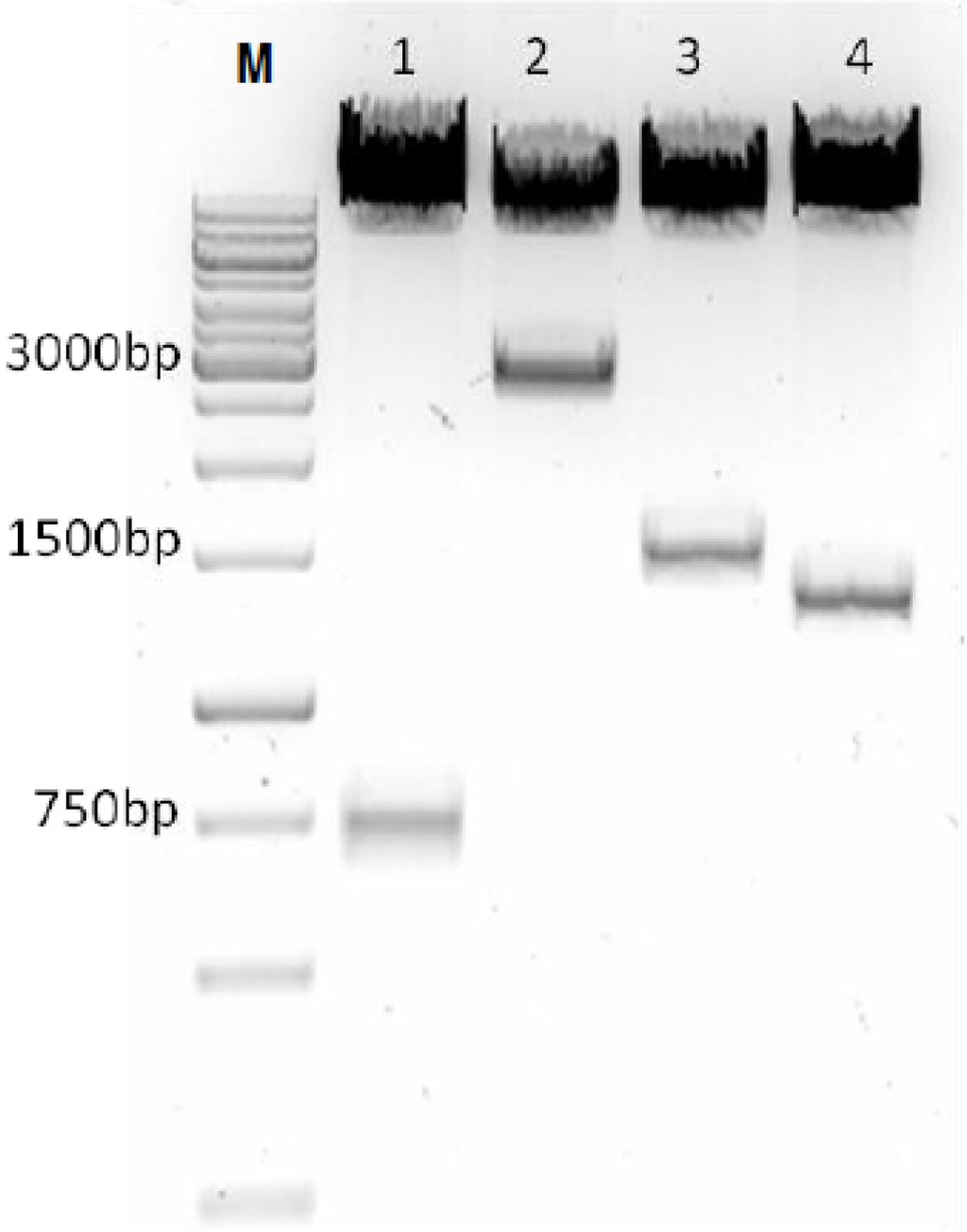 Restiction enzymes analysis of replicon constructs. Each plasmid was digested with Age1 and Asc1 restriction sites and analyzed on 1% agarose gel. The size of the products; Lane 1: pSAV/EGFP; lane 2: pSAV/PP; lane 3: pSAV/pVP2 and lane 4: pSAV/VP2; M: Marker (1 kb).