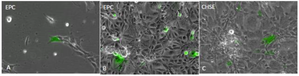 Chinook salmon embryo cells (CHSE-214, ATCC CRL-1681) and epithelioma papulosum cyprini (EPC, ATCC CRL-2872) cells were maintained in Leibovitz’s-15 (L-15, Life technologies, Paisley, Scotland) supplemented with 10% fetal bovine serum (FBS, PAA Laboratories,Pasching, Austria), 2 mM L-glutamine, 0.04 mM β-mercaptoethanol and gentamycin (50 μg/mL) for propagation of cells, while L-15 medium containing 2% fetal calf serum (FCS) was used for virus production. Both cell lines were maintained at 20 °C.