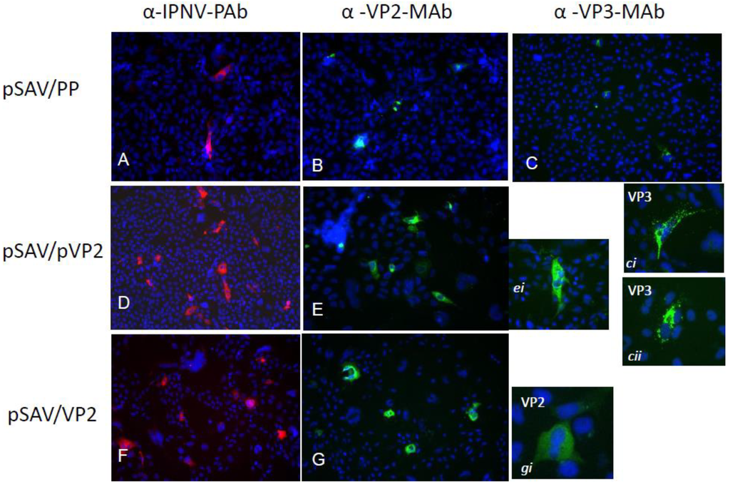 IPNV proteins expression in CHSE-214 cells transfected with pSAV/PP (A–C); pSAV-pVP2 (D) and (E); and pSAV-VP2 (F) and (G); (A,D,F) were immunostained with PAb anti-IPNV; (B,E,G), and close up pictures ei and gi were stained with MAb anti-VP2; (C) and close up pictures ci and cii were stained with MAb anti-VP3. Nuclei were counterstained with Hoescht 3334 (blue). Pictures were captured 6 days post transfection at 20× magnification. Secondary antibodies were conjugated with Alexa Fluor 594 (red) and Alexa Fluor 488 (green).