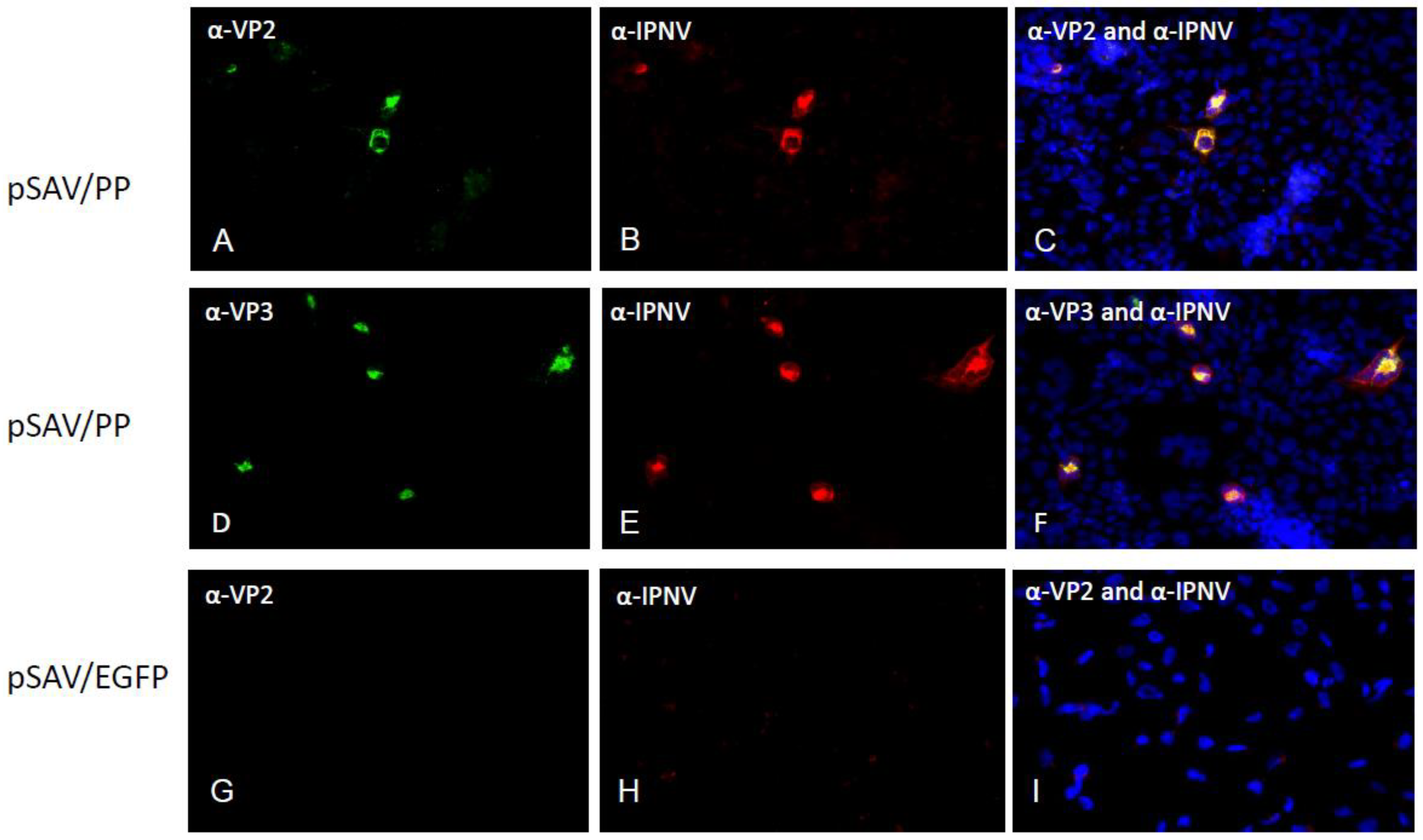 Co-immunostaining of pSAV constructs pSAV/PP and pSAV/EGFP transfected in CHSE-214 cells. (A–C) were immunostained with MAb anti-VP2 and PAb anti-IPNV; (D–F) were immunostained with MAb anti-VP3 and PAb anti-IPNV; (G–I) were pSAV/EGFP transfected (negative control). Nuclei were counterstained with Hoescht 3334 (blue). Pictures were captured 4 days post transfection at 20× magnification. Secondary antibodies were conjugated with Alexa Fluor 594 (red) and Alexa Fluor 488 (green).