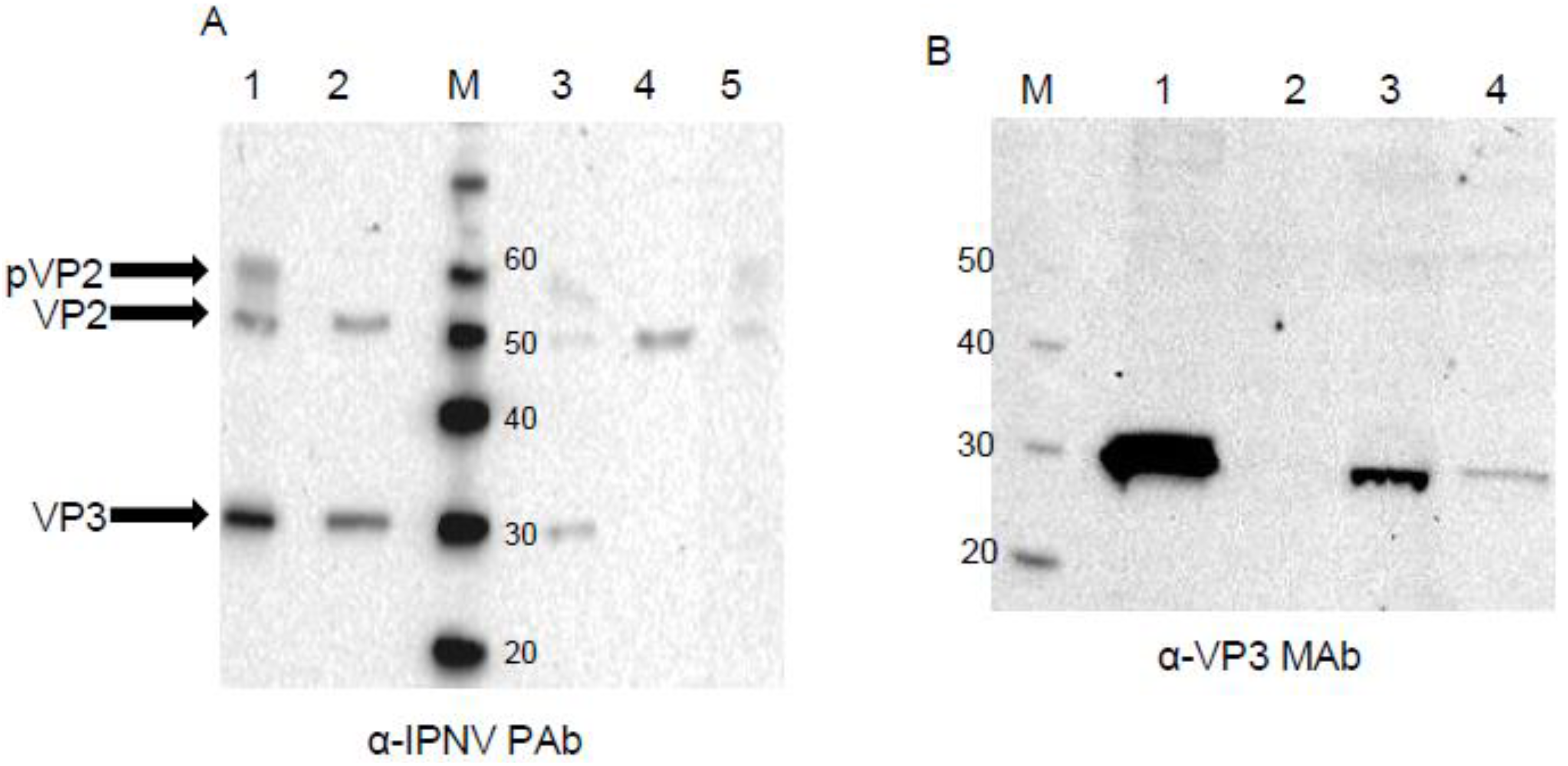 Western blots of CHSE-214 cells transfected with pSAV constructs, IPNV infected CHSE-214 cells lysates and purified IPNV particles. (A) Stained with PAb α-IPNV at 4 days post transfected. Lane 1: IPNV infected CHSE-214; lane 2 (positive controls): purified IPNV; M: marker; lane 3: pSAV/PP; lane 4: pSAV/VP2; lane 5: pSAV/pVP2; (B) Stained with MAb α-VP3 at 6 days post transfected. Lane 1: purified IPNV (positive controls); lane 2: pSAV/EGFP-transfected (negative control); lane 3: pSAV/PP, culture medium; lane 4: pSAV/PP, cell pellet.
