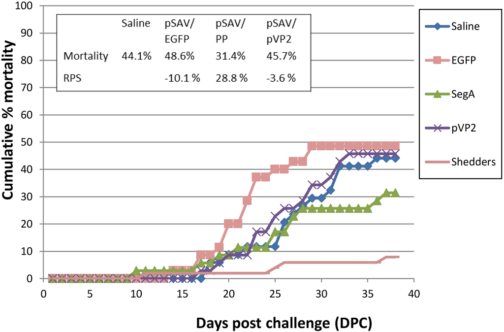 Percentage cumulative mortality of Atlantic salmon smolts in IPN immunization and challenge trial. Control groups (PBS and EGFP) and immunized groups (pSAV/PP and pSAV/pVP2). IPNV injected shedders fish (N = 53) were introduced at Day 0. Cumulative mortality and relative percent survival (RPS) was calculated at termination of challenge.