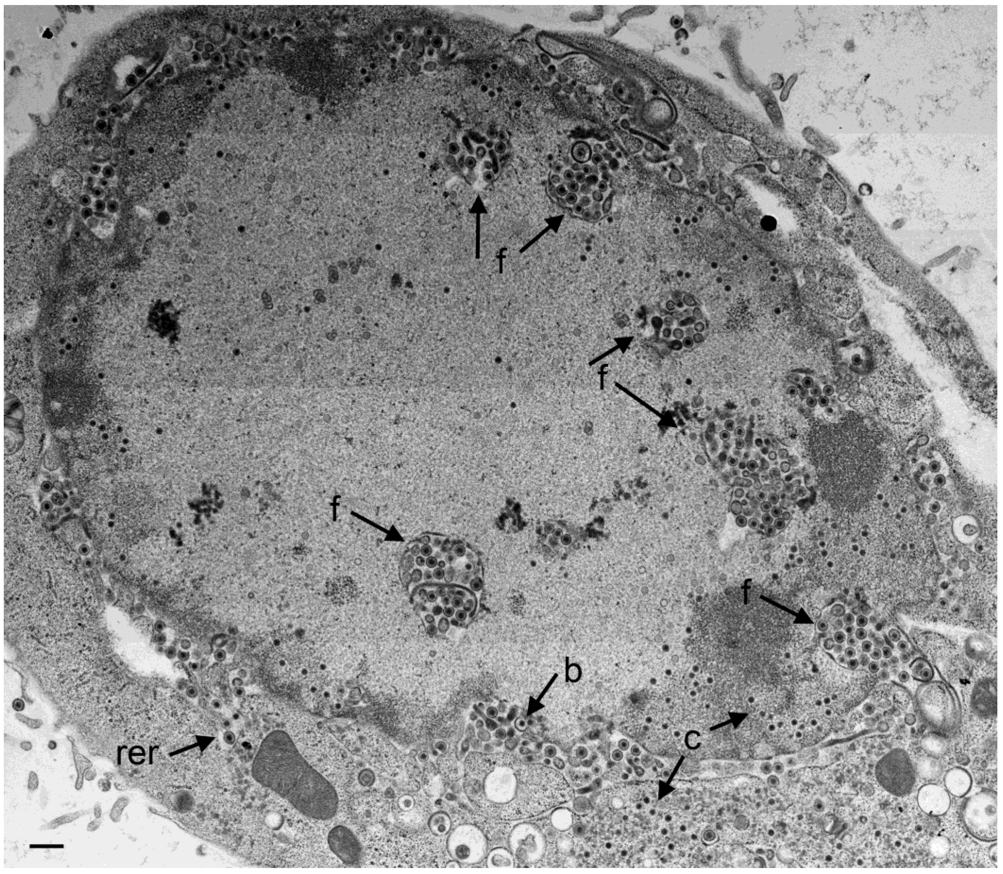 TEM of a Vero cell 24 hpi with R7041(∆Us3). Large number of virions are located in the PNS and in invaginations (f) formed by folding of the INM into the nucleus, and in “vacuoles” often referred to as herniations. They are considered likely to represent invaginations of the INM as easily apparent at the right bottom. A few virions are in the RER (rer) adjacent to the perinuclear space (PNS). Numerous capsids (c) are distributed in the nucleus and some in the cytoplasm. A few capsids bud (b) at the INM. Bar = 500 nm.