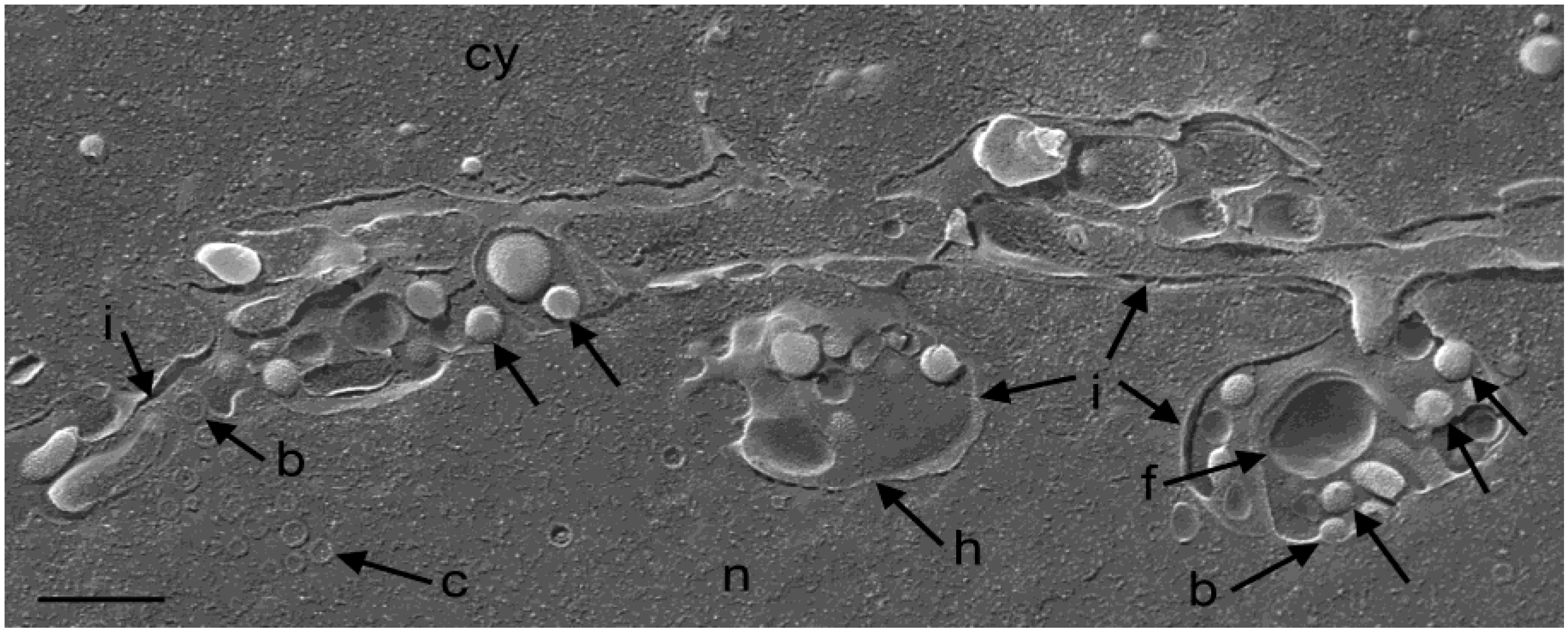 Cryo-FESEM of a R7041(∆Us3) infected Vero cell (12 hpi) showing a fracture plane through the nucleus (n) and the cytoplasm (cy). The INM (i) formed invaginations from which folds (f) arise. Membranes of herniations (h) continue into the INM. Capsids (c) bud (b) at the INM. Virions (arrows) are in invaginations and in the PNS. Bar = 500 nm.