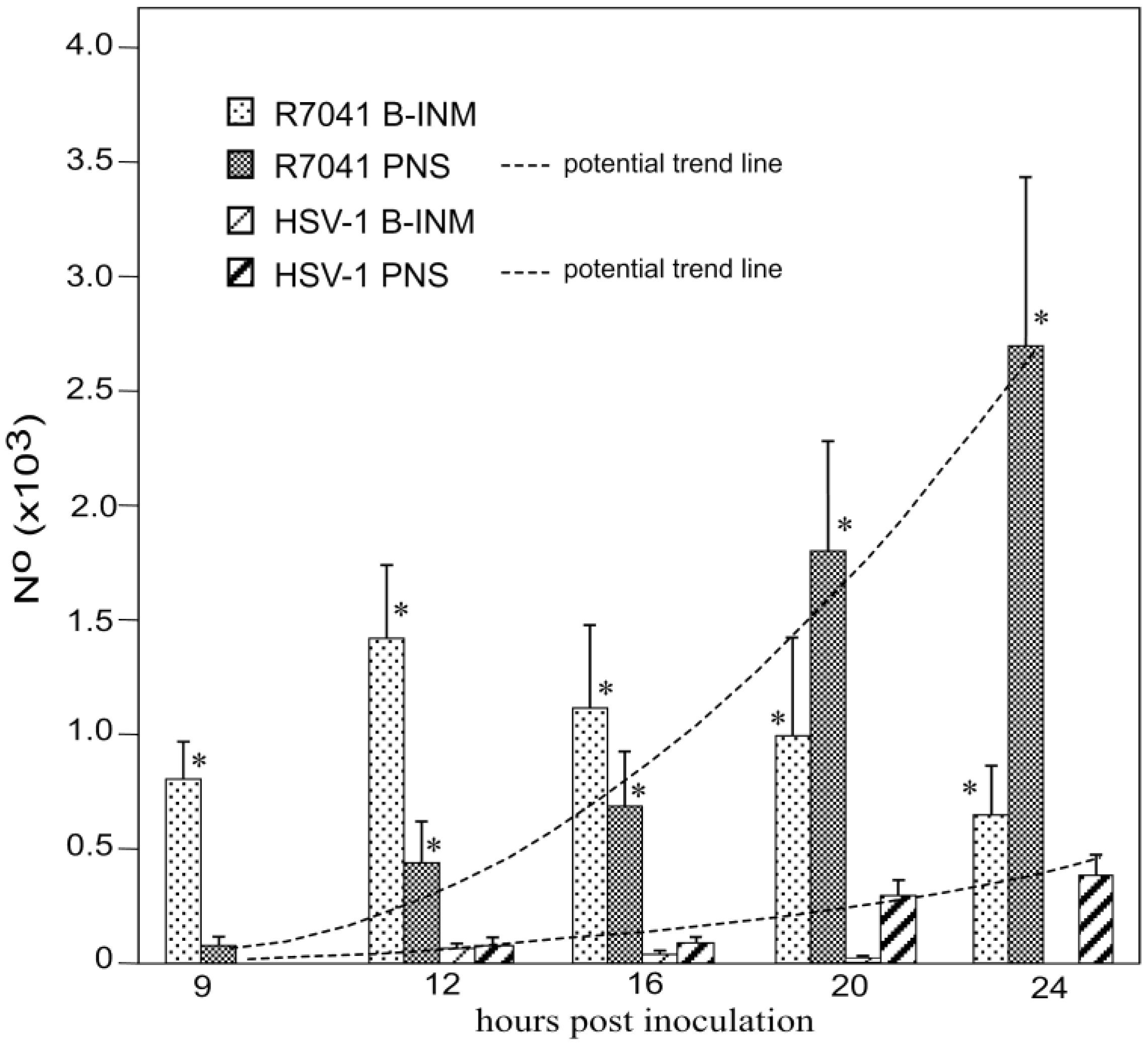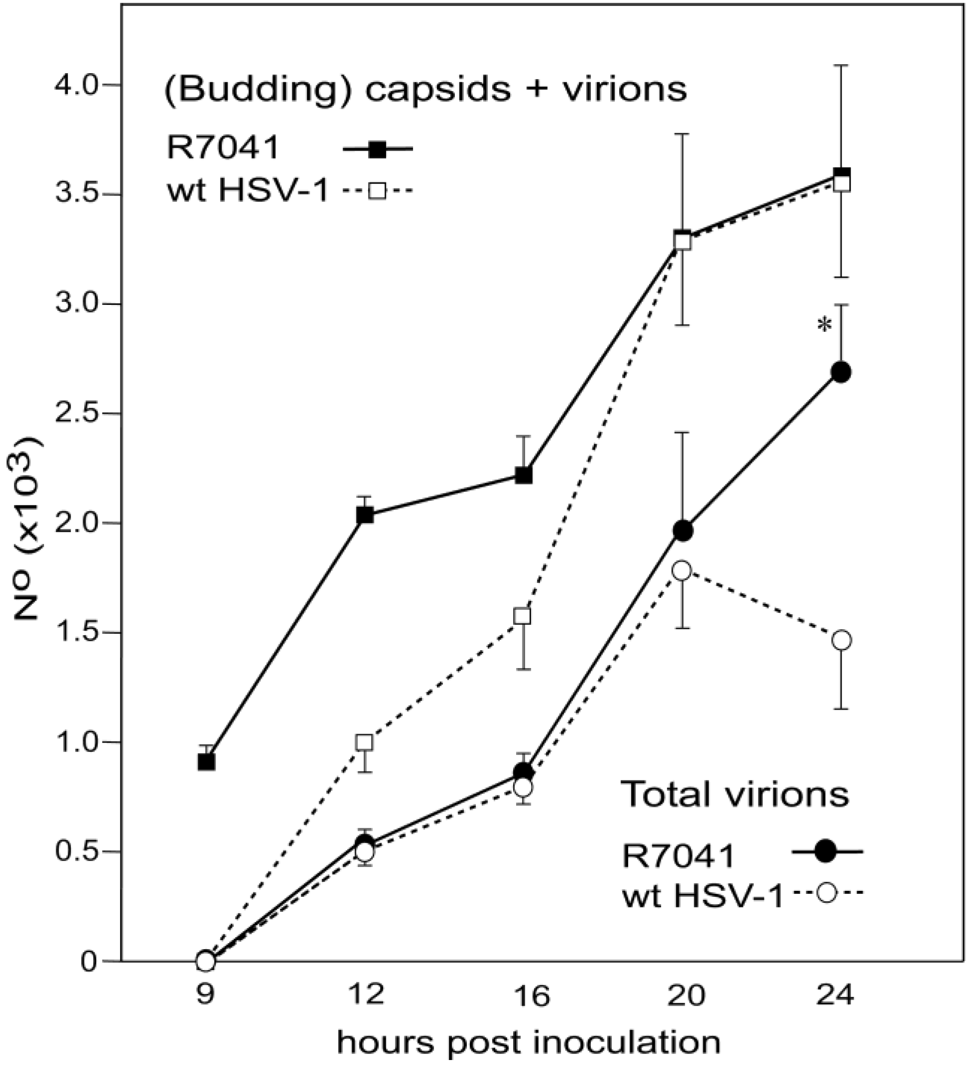 Mean and standard deviation of R7041(∆US3) and wt HSV-1 capsids budding at the INM, and of virions within the PNS calculated per mean nuclear volume. Budding of R7041(∆US3) capsids peaked at 12 hpi whereas the number of R7041(∆US3) and wt HSV-1 virions potentially increased (potential trend lines) though with a difference of more than 2000 virions by 24 hpi. p < 0.0001, n = 5.