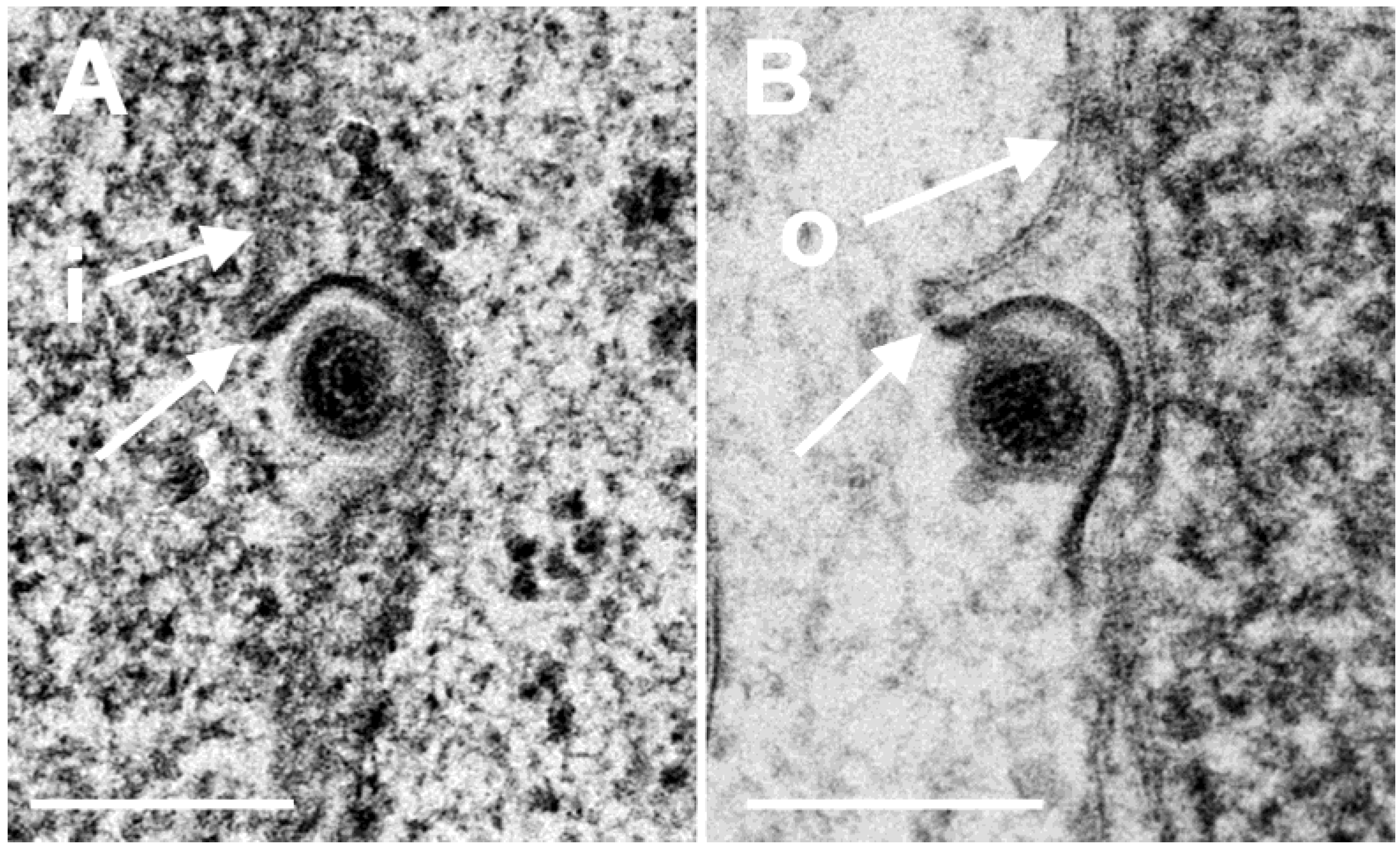 TEM images of budding capsids (A) at the INM (i) and (B) at the ONM (o). Note the identity of the two phenotypes, the ridge (arrows) formed on one side at each particle, and the eccentricity of the process. Ridges and eccentricity are not consistent with fusion. Bars 200 nm.