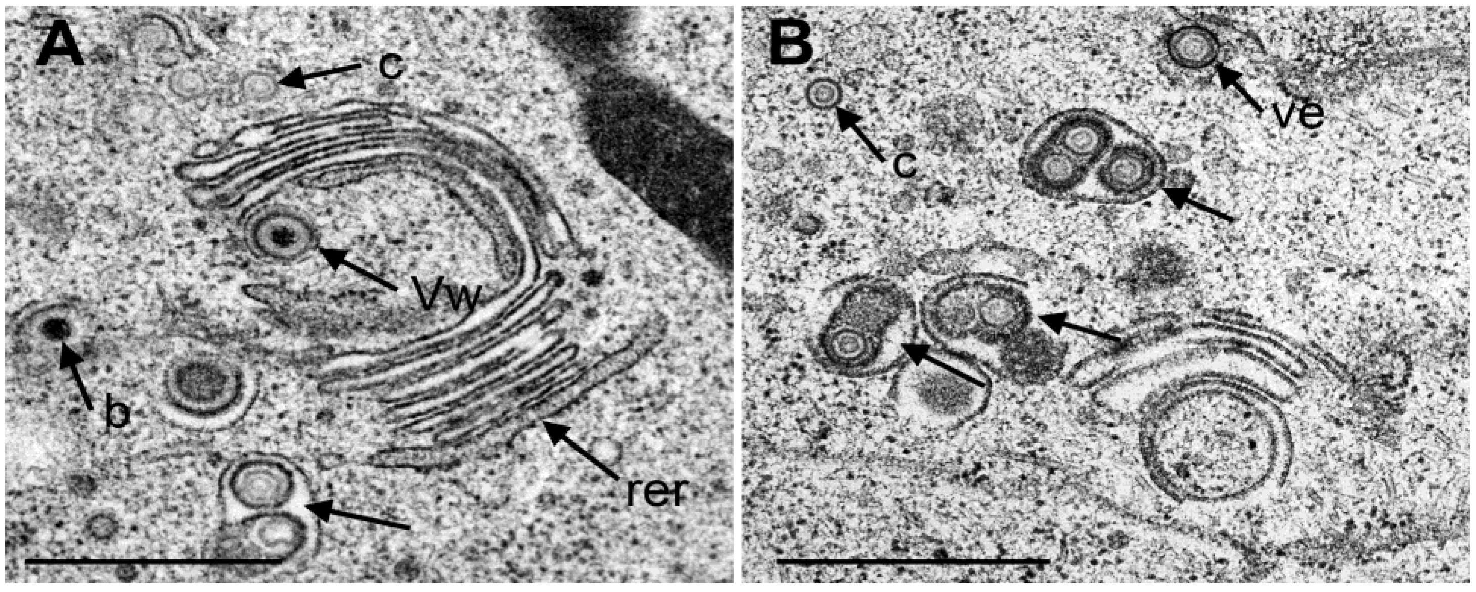 TEM images of Golgi fields in Vero cells at 12 hpi with wt HSV-1(A) and at 20 hpi (B) with the repair mutant R2641. (A) Close to a large Golgi stack is a virion in a concentric vacuole (Vw) derived by wrapping. Typically, the space between viral envelope and vacuolar membrane is similar in electron density as the tegument. In contrast, the space between viral envelope and membrane of vacuoles or Golgi cisternae containing one or more virions (arrow) derived either by budding into it or by intraluminal transportation from the RER. The space between virions and vacuolar membrane is electron lucent. (c) capsids, (b) budding capsid. Note that the outermost membrane of the Golgi stack shows the characteristic of RER membranes (rer) indicating connectivity between Golgi complex and RER. (B) Three vacuoles or Golgi cisternae (arrows) close to a small Golgi stack contain virions derived by budding or by intraluminal transportation. One virion is in the RER (Ve), and one capsid in the cytoplasm. Bar = 500 nm.