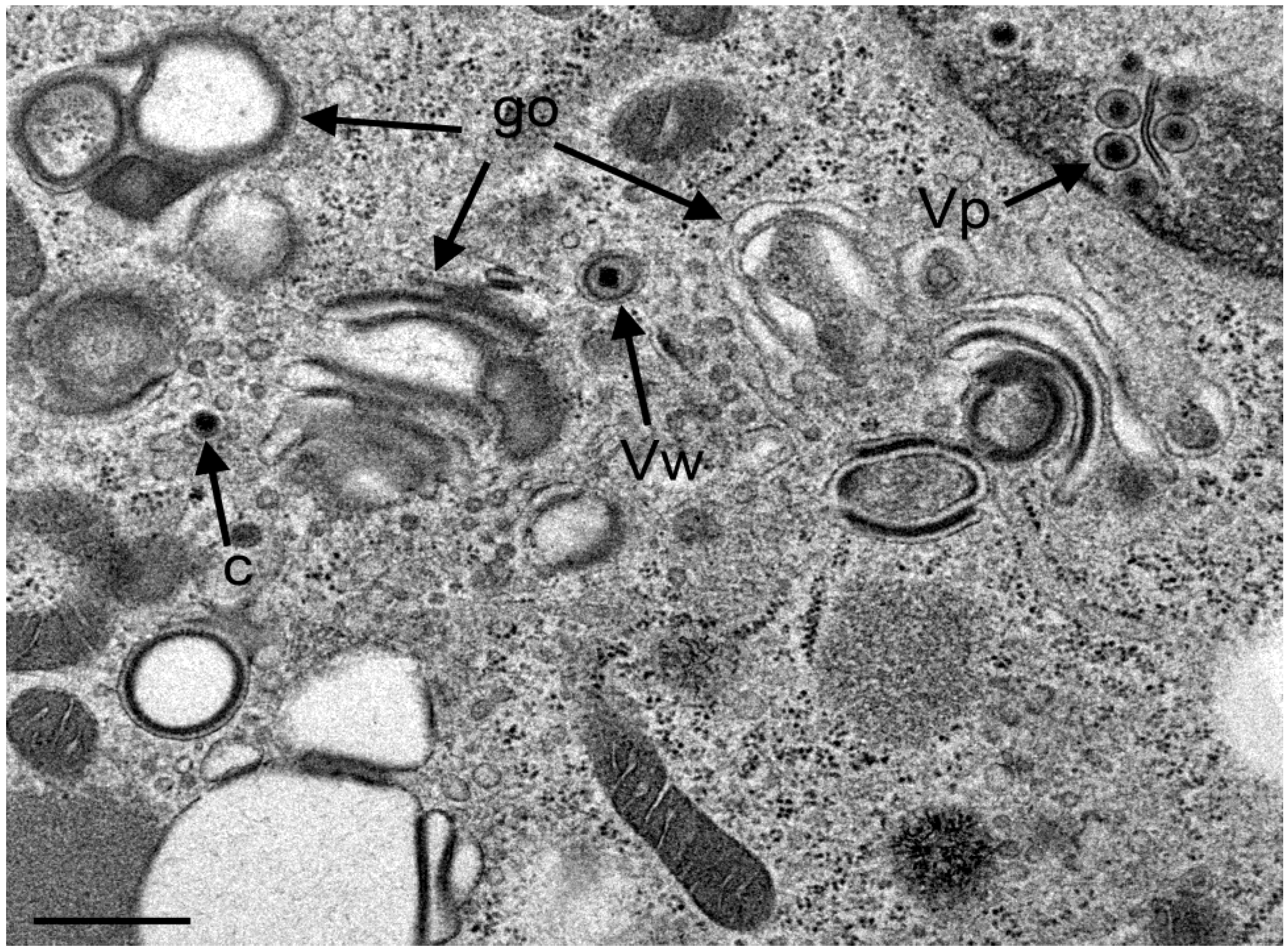 TEM images of three Golgi fields (go) containing thick electron dense membranes at 24 hpi with R7041(∆US3). One virion has probably entered the cisterna by budding or via intraluminal transportation (Vg), the other virions has been probably derived by wrapping (Vw). Note the difference in electron density of the space between viral envelope and vacuolar membrane. Bar = 500 nm.