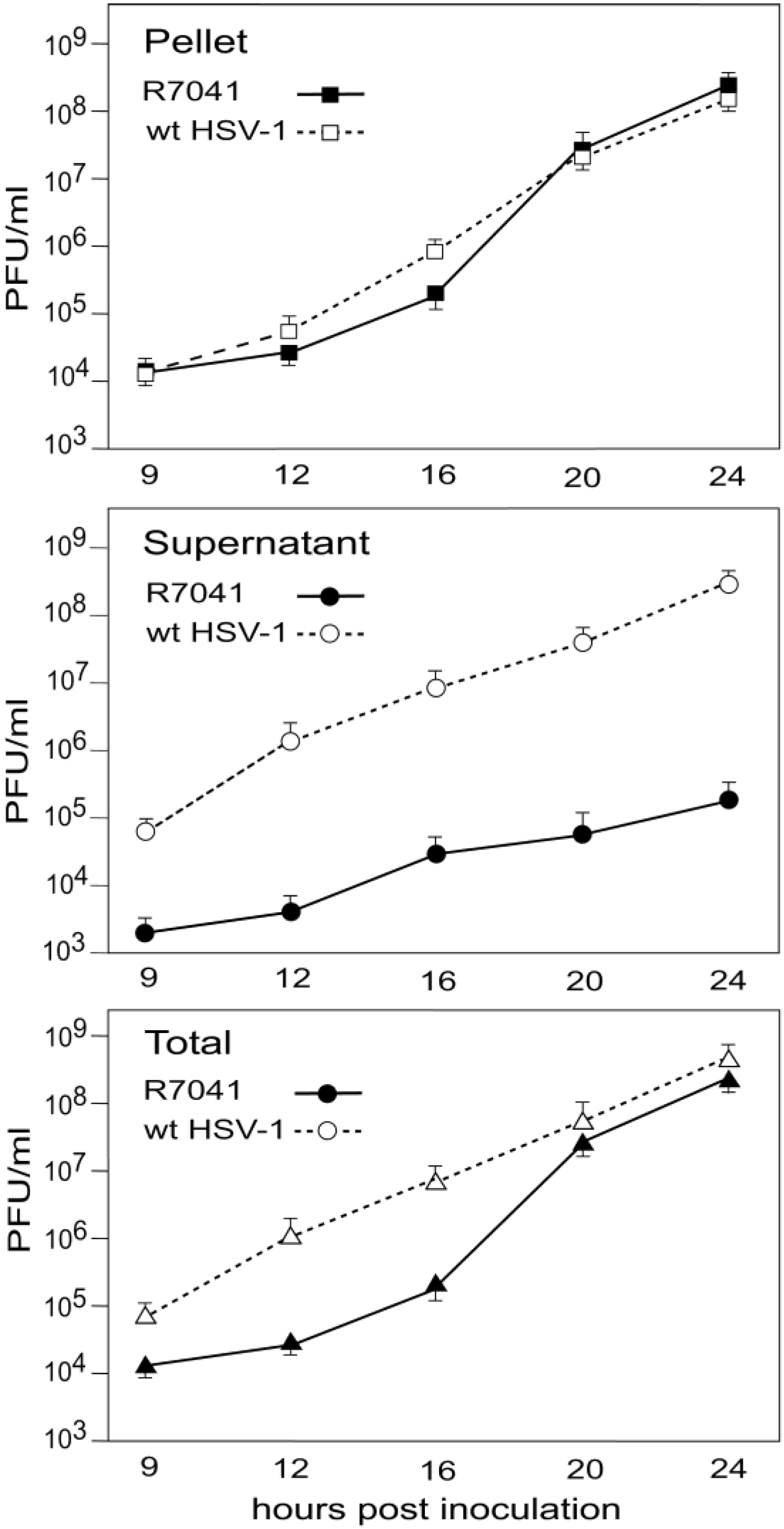 One-Step growth curves of R7041(∆Us3) and wt HSV-1. Cells were harvested at times post inoculation as indicated. Infectious virus yields in pellets and supernatants were determined by plaque titration. Mean and standard deviation were calculated from 4 experiments.