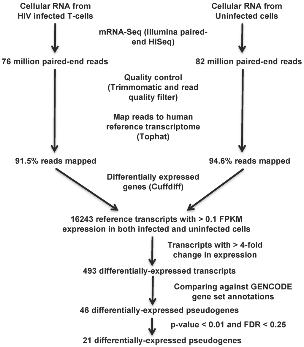 Computational pipeline to identify differentially-expressed pseudogenes from transcriptomic data. The transcriptomic data collected from HIV-1 infected and uninfected H9 T-cells 7 days post-infection were mapped to the human reference transcriptome after quality control analysis. Differentially-expressed pseudogenes were identified following several stringent filtering steps that are the accepted standard in the field: at least >4-fold change in expression, p-value < 0.01 and FDR < 0.25.