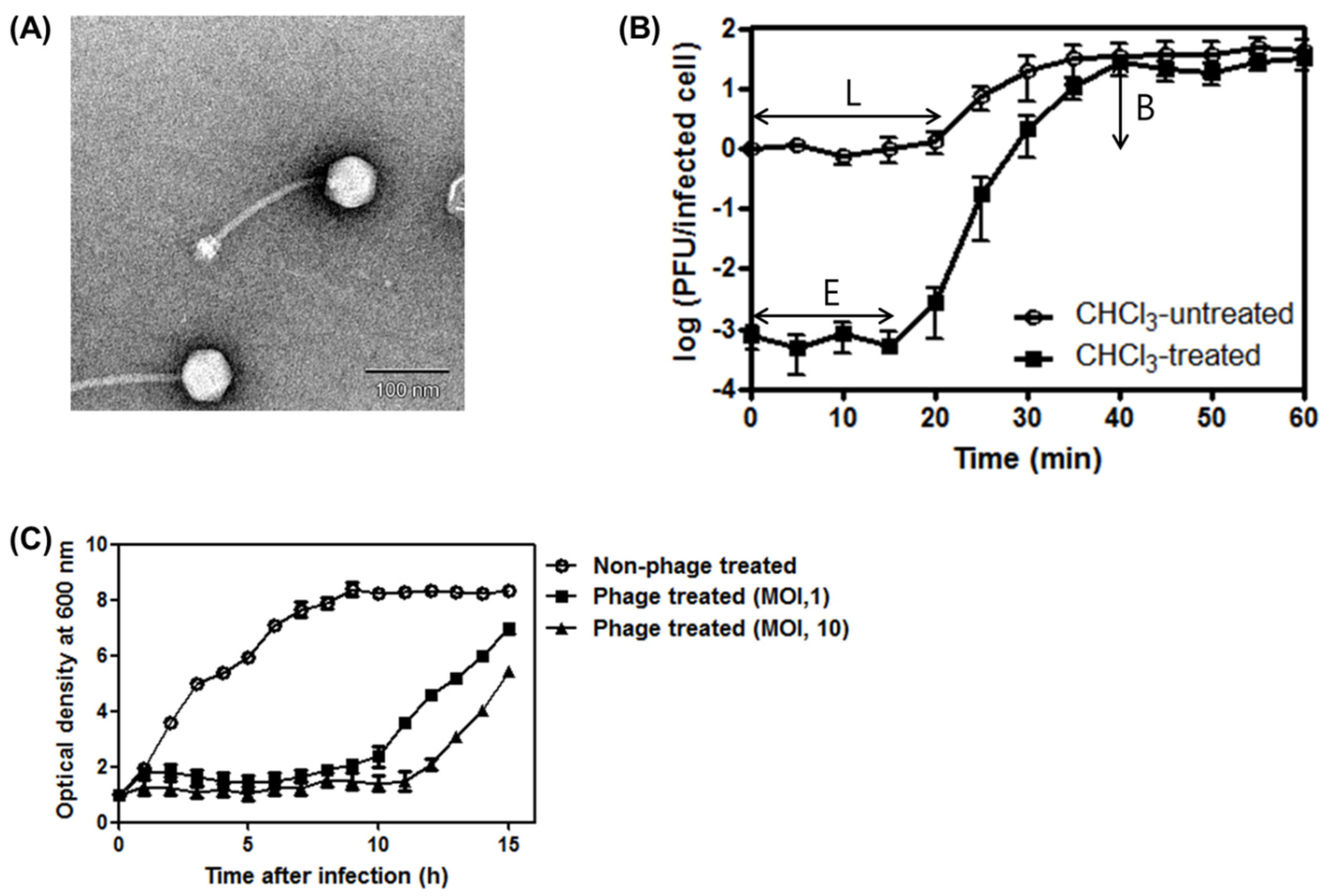 The phage SA97 was analyzed using transmission electron microscopy (TEM). The phage suspension was placed on a carbon-coated copper grid and negatively stained with 2% uranyl-acetate (pH 4.0). The sample was examined under an energy-filtering transmission electron microscope at an operating voltage of 120 kV [18]. Phage SA97 was identified and classified according to the guidelines of the International Committee on Taxonomy of Viruses [19].