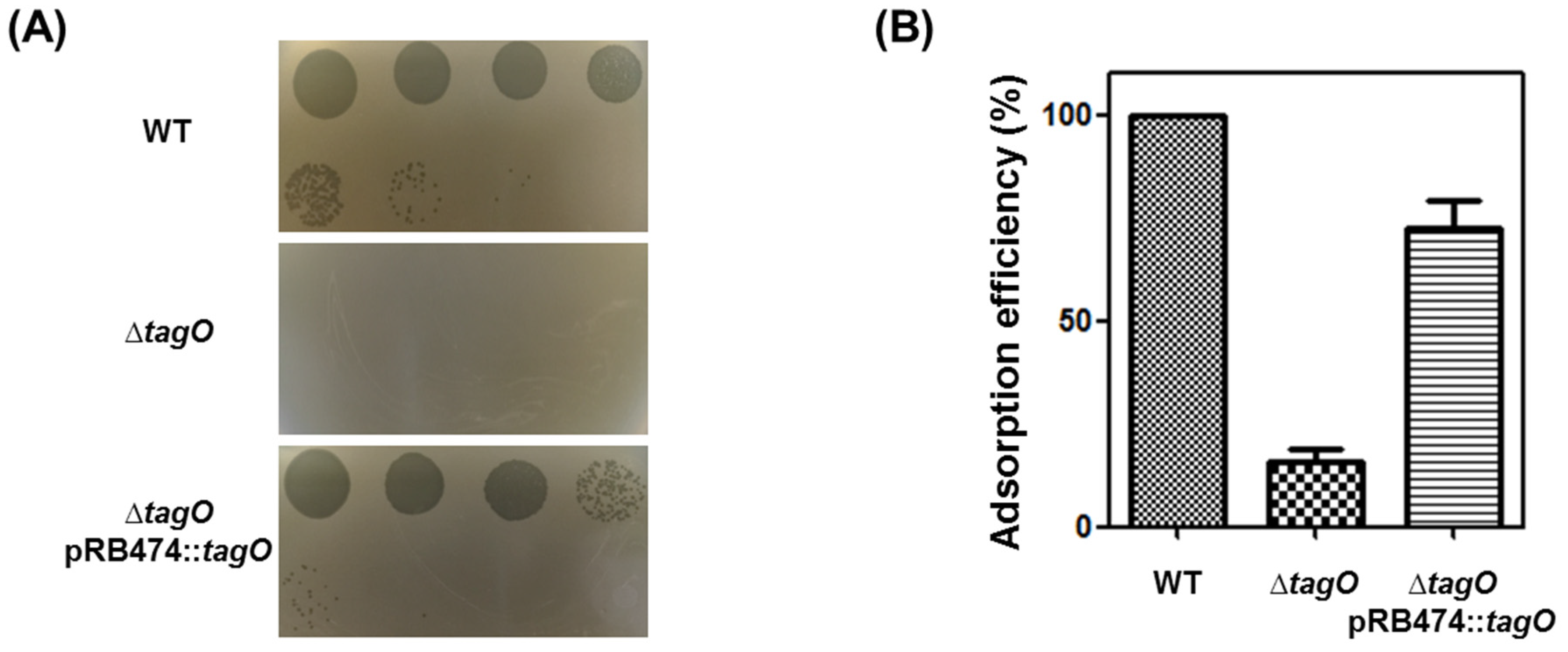 (A) Wall teichoic acid (WTA)-dependent infection of S. aureus phage SA97. The phage SA97 lysate was spotted onto lawns of wild-type RN4220 (WT), ΔtagO mutant (ΔtagO), and tagO-complemented (ΔtagO pBR474::tagO) strains. Plaque formation indicates successful adsorption and infection by the phage SA97. EOP relative to WT strain was 7.5 × 10−2 ± 0.2 × 10−2 on ΔtagO pBR474::tagO strain; (B) WTA-dependent adsorption ability of S. aureus phage SA97. The adsorption efficiency relative to the adsorption to wild-type strain RN4220, which was set to 100%, is indicated. The data shown are the mean values from three independent measurements and the error bars represent the standard deviations.