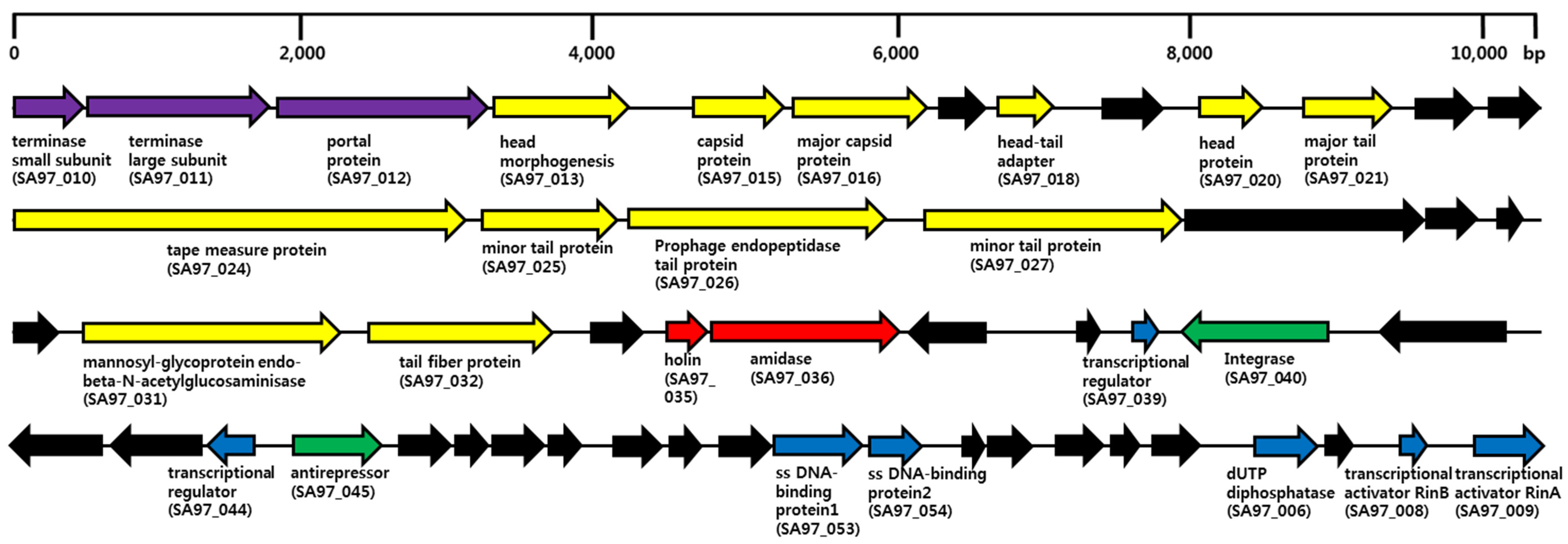 A few putative genes associated with lysogen formation [antirepressor (SA97_045) and integrase (SA97_040)] were detected in the category of DNA manipulation and regulation; however, the major components of the lytic/lysogenic decision gene cluster, cI- or cro-like repressors, were missing.