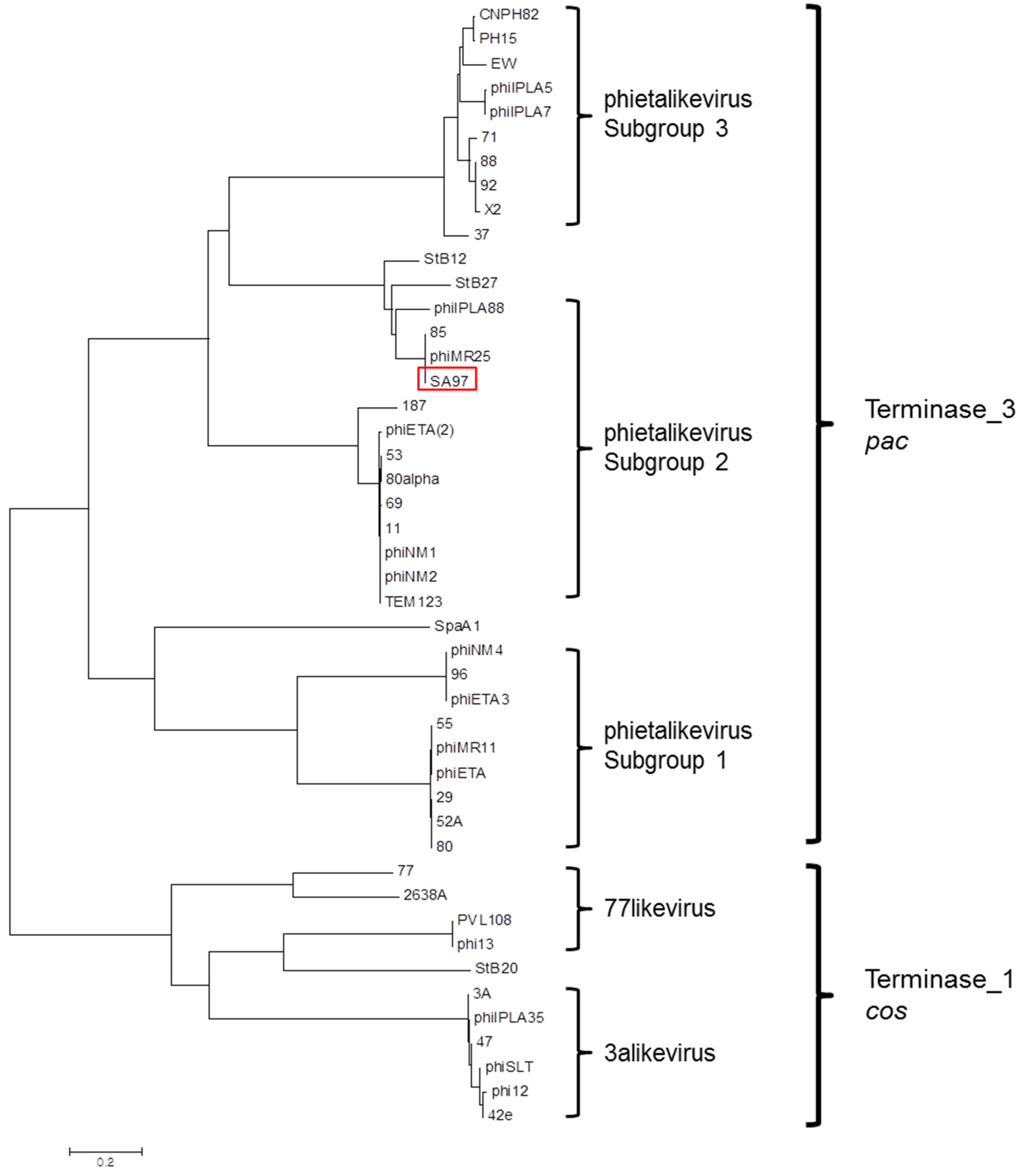 A phylogenetic analysis of the terminase large subunits in the staphylococcal bacteriophages, including phage SA97, was performed (Figure 4). According to a previous study [46], Siphovirus staphylococcal phages cluster into three groups: “3alikevirus”, “77likevirus” and “phietalikevirus”. “phietalikevirus” includes 31 staphylococcal phages, which are theoretically divided again into three subgroups based on DNA similarity. The terminase large subunit of phage SA97 is similar to those of phage 85 [47] and phiMR25 [48], so that SA97 could be classified into the phietalikevirus subgroup2 as shown in Figure 4. Terminase large subunit of SA97 (SA97_011) has a terminase_3 domain like B. subtilis phage SPP1, which is known to use the pac site for DNA packaging [49], suggesting the possibility that SA97 would also use a pac mechanism for packaging DNA. Moreover, the tail morphogenesis module of SA97 consists of the SGNH hydrolase superfamily (SA97_026), tail protein (SA97_027), virion-associated peptidoglycan hydrolase (SA97_032) and tail fiber protein (SA97_033). The composition is the same as that of phages involved in “phietalikevirus subgroup2” as analyzed by Gutierrez et al [46]. Additional comparative genomic analysis of phage SA97 with phietalikevirus subgroup2 phages such as phage 85 and phage phiMR25 (Figure 5) revealed that DNA packaging and structure (heads and tails) gene clusters are highly conserved but the lysis/lysogeny control regions (Integrase, Repressor, Antirepressor and Cro-like protein) are not, suggesting that phage SA97 may have distinctive lytic/lysogenic decision mechanism even though phage SA97 is grouped in the phietalikevirus subgroup2 with phage 85 and phage phiMR25. The host cell lysis mechanism of SA97 is also expected to be different from those of phage 85 and phiMR25 because the endolysin and holin genes of SA97 differ from those of phage 85 and phiMR25.