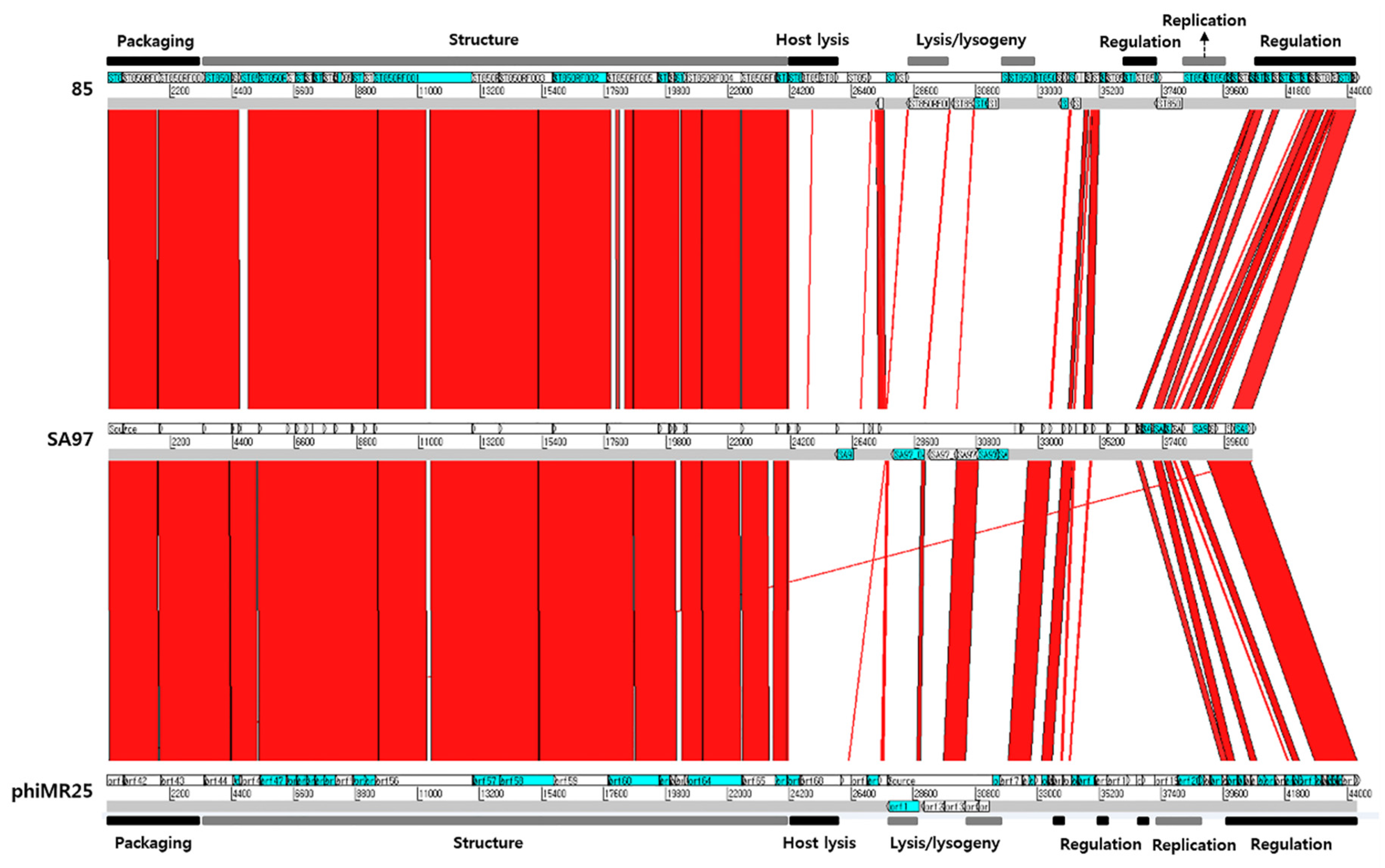 Comparative genomic analysis of phietalikevirus subgroup2 phages (SA97, 85 and phiMR25) with BLASTN and ACT12. Black and gray bars indicate the functions of gene clusters in the genomes.