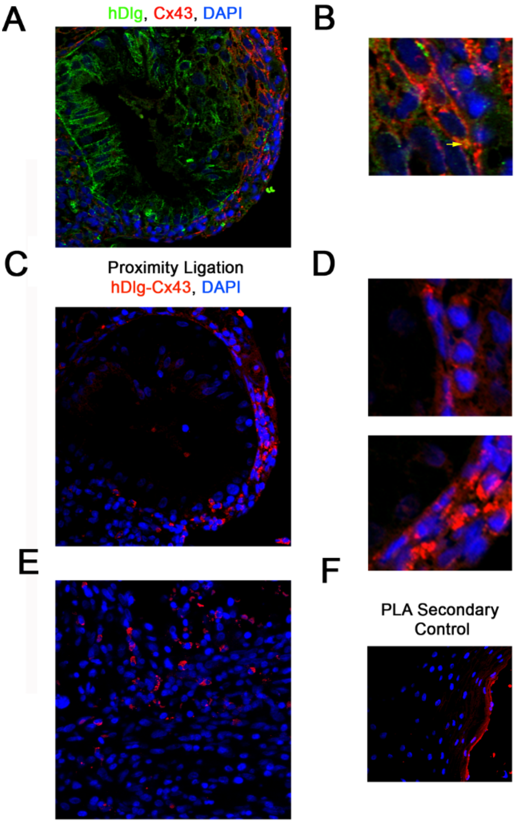 Cx43 and hDlg interact directly in cervical tumour cells in vivo. (A) Representative immunofluorescence image showing a section of a high grade cervical lesion; (B) A region of Cx43 and hDlg colocalisation in (A) enlarged 5×. Immunofluorescence shows hDlg (green), Cx43 (red) and DAPI (blue). The yellow arrow indicates one area of Cx43/hDlg colocalisation; (C) Immunofluorescence proximity ligation for hDlg and Cx43, where red staining indicates colocalisation of the proteins within 40 nm of each other; (D) Regions of Cx43 and hDlg colocalisation detected by PLA in C enlarged 5×; (E) Immunofluorescence proximity ligation for hDlg and Cx43 in a region of a cervical tumour; (F) Immunofluorescence proximity ligation secondary control on the outer region of the cervical lesion a part of which is shown in (C).