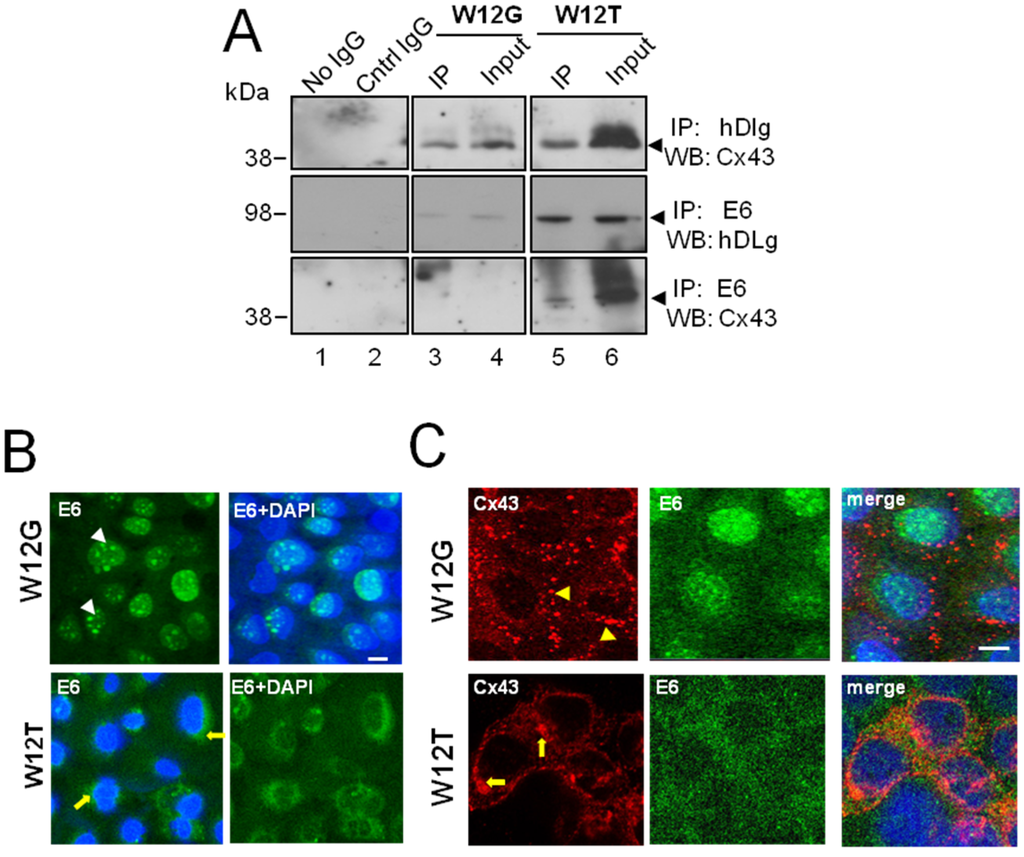 Structural analysis has demonstrated that PDZ domains in hDlg can bind to the X-S/T-X-V/L protein motif of high risk HPV E6 proteins []. As we have shown previously that the C-terminal domain of Cx43 interacts with the N- and C- termini of hDlg [], it is possible that E6, a 17 kDa protein, could form a complex with hDlg while hDlg is also bound to Cx43. Therefore we investigated formation of protein complexes between Cx43, hDlg and E6 by co-immunoprecipitation in W12G (non-tumour cervical epithelial cells) and in W12T (cervical tumour) cells (Figure 2).