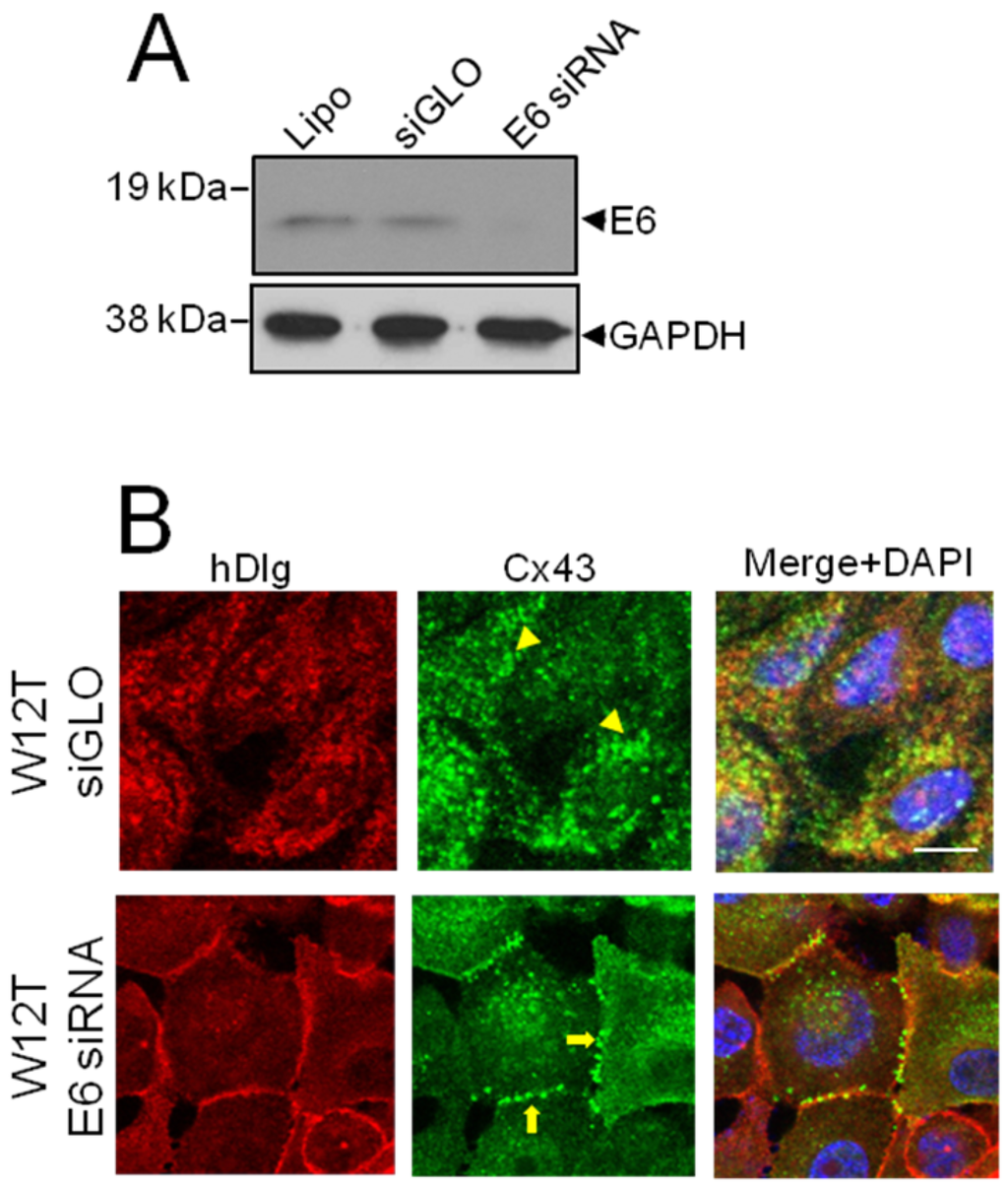 In this study we first demonstrate a physical association between hDlg and Cx43 in vivo. The known interaction of E6 with hDlg prompted us to investigate whether HPV16 E6 could interact with and regulate the subcellular location of the hDlg/Cx43 complex. We detected association of E6 with Cx43 at low levels in W12T cells. However, E6 siRNA depletion in W12T cells caused redistribution of Cx43 from the cytoplasm to the membrane. Conversely, overexpression of HPV 16 or 18 E6 in HPV-negative C33a cells resulted in reduced levels of Cx43 and redistribution from the membrane to the cytoplasm. Finally, HPV-negative C33a cells overexpressing a wild type or mutant HPV18 E6 demonstrated the critical role E6 plays in membrane localisation of Cx43. These findings reveal a novel E6-regulated pathway through which Cx43 trafficking, and potentially GJIC, is altered in cervical tumour cells.