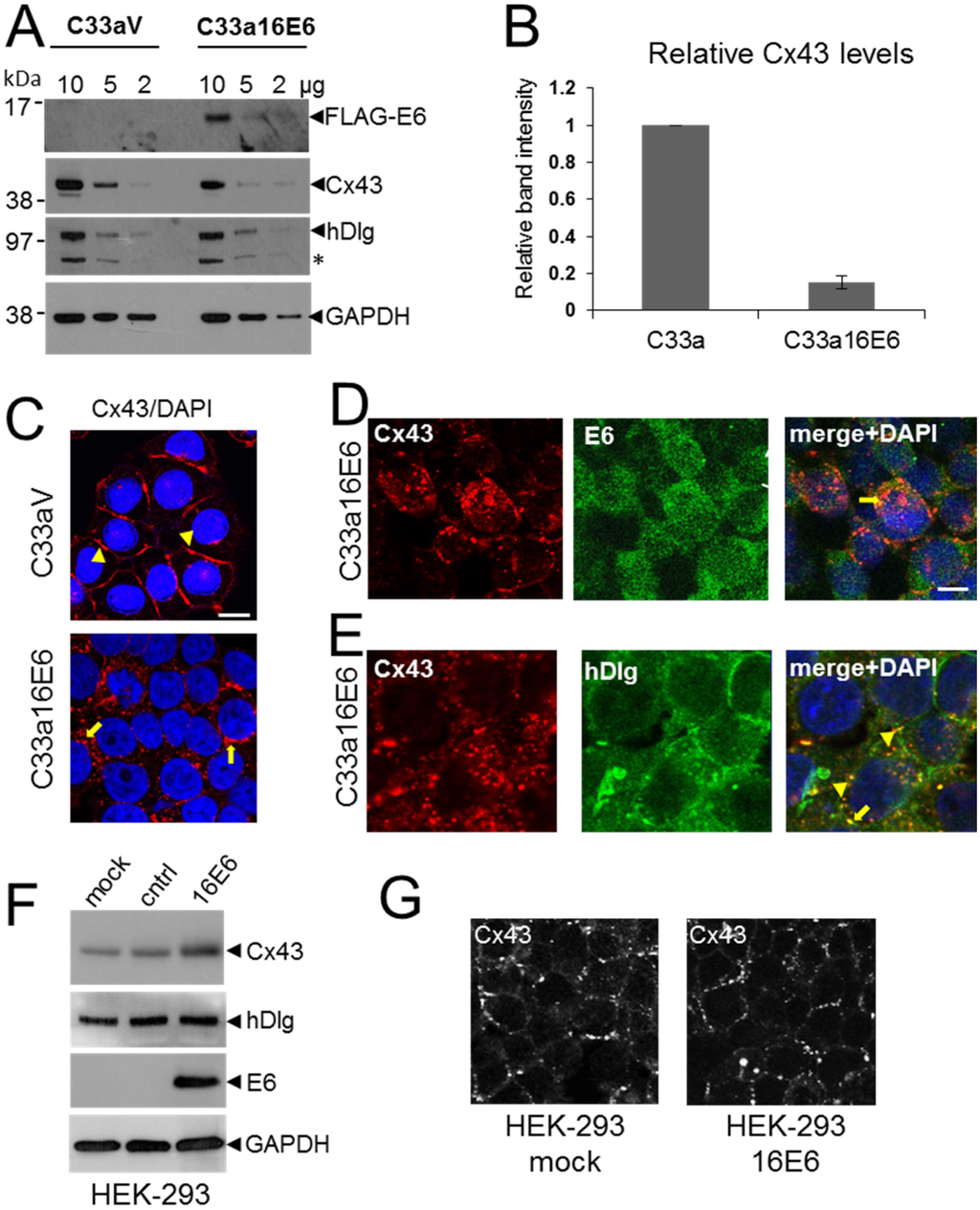 C33a cells normally retain strong GJIC and display Cx43 gap junction plaques on the plasma membrane [] indicating that HPV expression might regulate GJIC in tumour cells. To confirm our data that E6 regulates Cx43 intracellular trafficking we examined the effect of E6 expression on Cx43 and hDlg in C33a cells using confocal immunofluorescence microscopy. Figure 4C (arrowheads) shows that Cx43 was located primarily on the plasma membranes between adjacent C33aV cells. In contrast, in C33a16E6 cells Cx43 was primarily localised within intracellular regions (Figure 4C arrows), with a marked reduction in membrane gap junction plaques. Figure 4D show that in these cells E6 was located throughout the cytoplasm and the nucleus with some evidence of colocalisation with Cx43 on the plasma membrane (arrowhead) and in the cytoplasm (arrow). In contrast to what we observed in W12T cells, hDlg was found mainly at the cell periphery and there was only limited colocalisation of hDlg with Cx43 in the cytoplasm of C33a16E6 cells (Figure 4E). To test the effect of ectopic expression of HPV16 E6 on Cx43 levels in a non-cervical tumour cell line we transfected the FLAGE6 expression vector into HEK-293 cells. Figure 4F shows that no change in hDlg levels was detected when E6 was expressed and instead of a decrease in Cx43 levels a slight increase was observed. E6 expression did not cause Cx43 relocation from the membrane in these cells (Figure 4G).